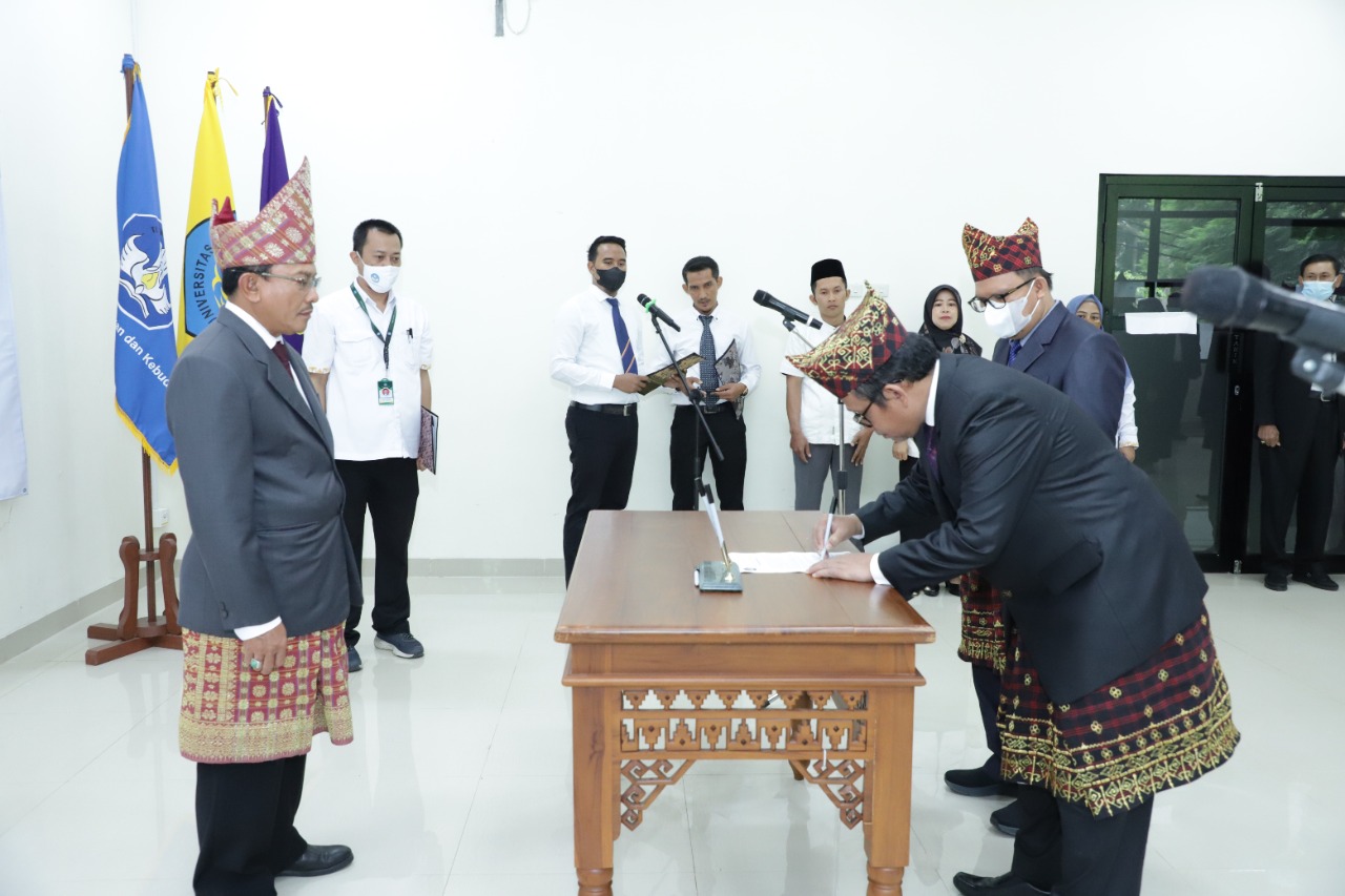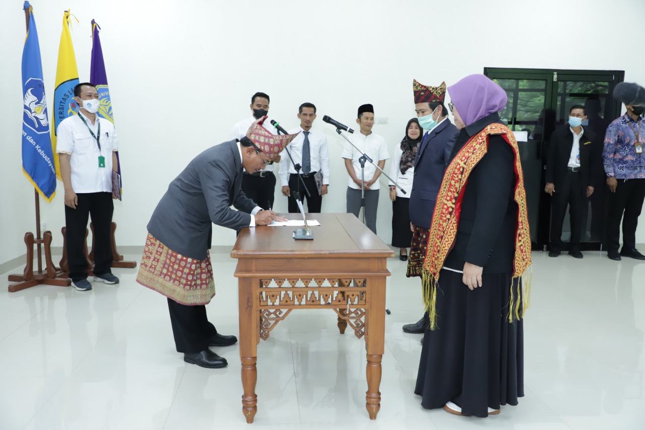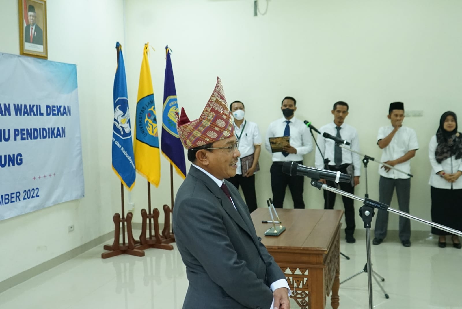 (Unila): Plt. Rektor Universitas Lampung (Unila) Dr. Mohammad Sofwan Effendi, M.Ed., menghadiri serah terima jabatan tiga wakil dekan Fakultas Keguruan dan Ilmu Pendidikan (FKIP), Rabu, 23 November 2022. Para wakil dekan terpilih akan menjabat posisi tersebut dalam empat tahun mendatang.