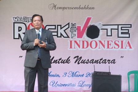 Pernyataan tersebut ditegaskan Pembantu Rektor III Universitas Lampung (Unila) Prof. Sunarto dalam pembukaan kegiatan Rock The Vote Indonesia, di Lapangan Basket Unila, Senin (3/3) pagi. Kegiatah diikuti ratusan pelajar dan mahasiswa di Bandarlampung.