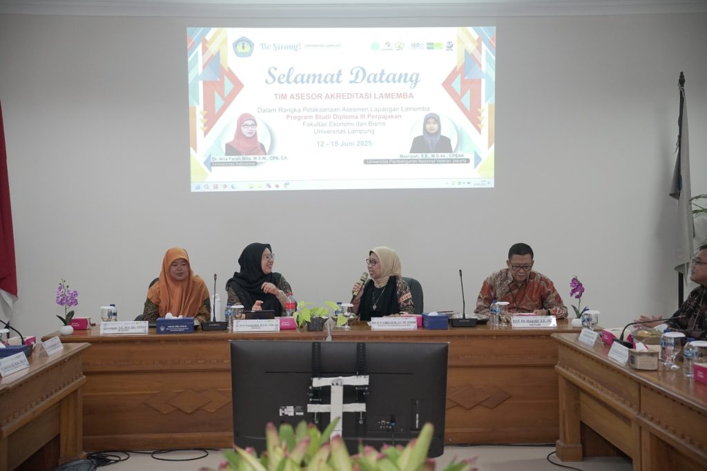 (Unila): Fakultas Ekonomi dan Bisnis (FEB) Universitas Lampung (Unila) menyelenggarakan asesmen lapangan akreditasi untuk Program Studi (Prodi) D-3 Perpajakan. Rangkaian proses asesmen Lembaga Akreditasi Mandiri Ekonomi Manajemen Bisnis dan Akuntansi (LAMEMBA) ini berlangsung pada Jumat, 13 Juni 2025, di Gedung B FEB Unila.