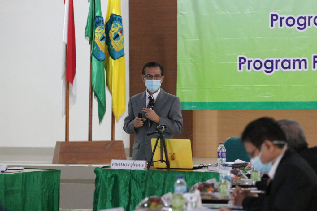 Promovendus Muhammad Syamsoel Hadi mempresentasikan disertasi berjudul “Karekteristik Genotipe Sorgum (Sorghum Bicolor [L] Moench) pada Sistem Tumpang sari dengan Ubi Kayu Berdasarkan Sifat Agronomi, Produksi Bioetanol, dan Keberadaan Serangga” di hadapan tim penguji dan audiens.