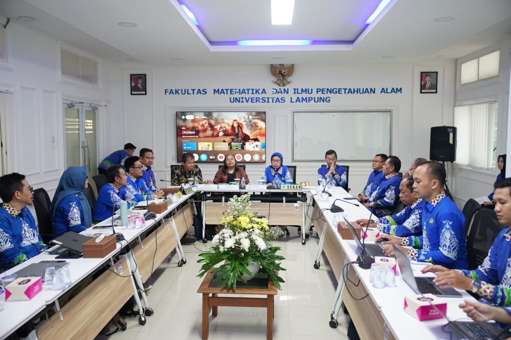 Kegiatan berlangsung di ruang sidang lantai dua Gedung Dekanat FMIPA Unila, Kamis, 22 Mei 2025, dan merupakan bagian dari proses asesmen Lembaga Akreditasi Mandiri Sains Alam dan Ilmu Formal (LAMSama).