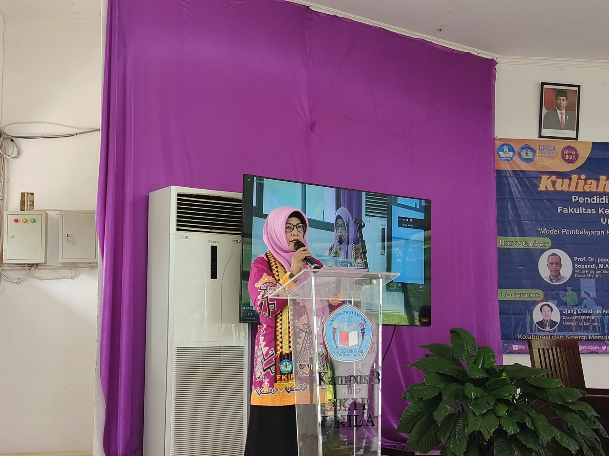 Kegiatan berlangsung pada Rabu, 22 Mei 2024, dengan format daring melalui Zoom dan luring di Aula Kampus B FKIP Unila.