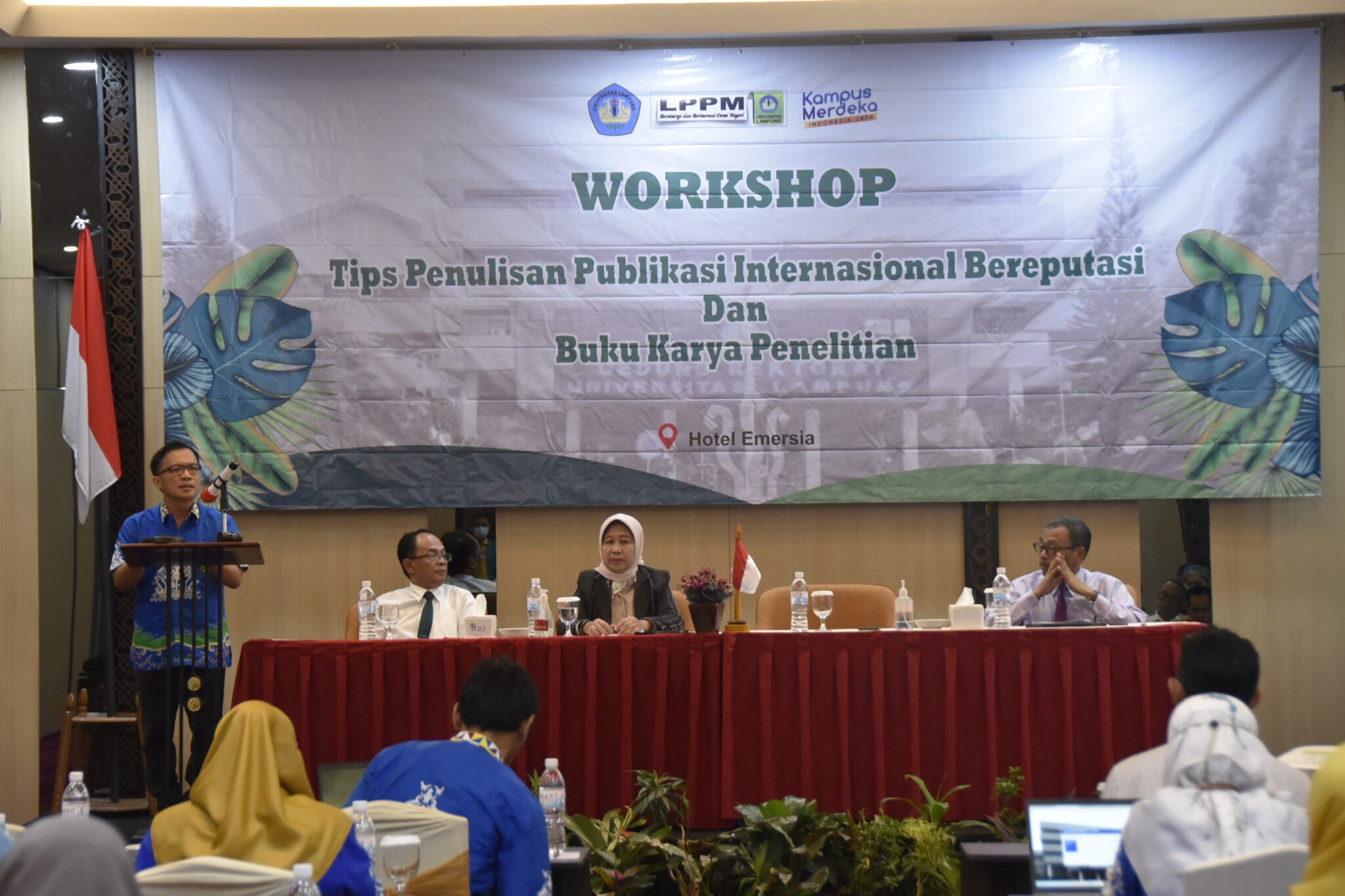 Rektor Universitas Lampung Prof. Dr. Ir. Lusmeilia Afriani, D.E.A. I.P.M., membuka secara resmi Workshop Tips Penulisan Publikasi Internasional Bereputasi dan Buku Karya Penelitian di Hotel Emersia Bandar Lampung, Kamis 16 Februari 2023.