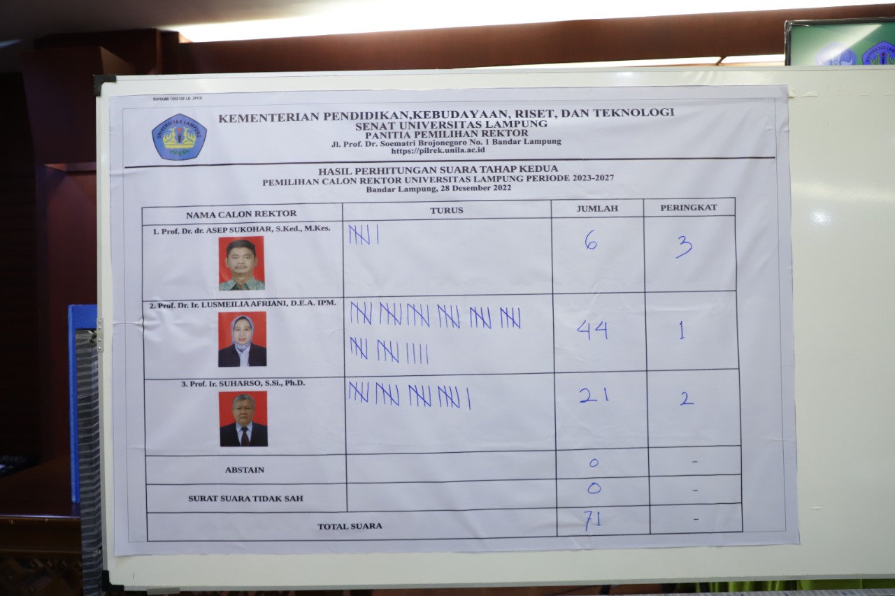 Sementara dua calon lainnya yakni Prof. Ir. Suharso, Ph.D., berada di posisi kedua dengan perolehan suara 21 dan Prof. Dr. dr. Asep Sukohar, S.Ked., M.Kes., sebanyak enam suara.