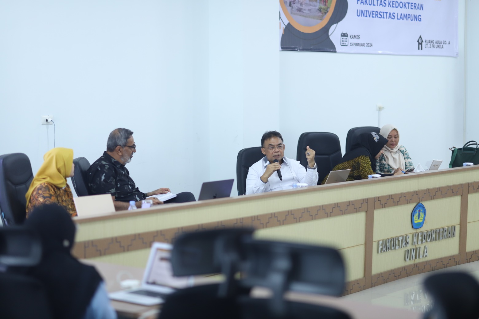 Prof. Arshad Ahmad yang juga Konsultan ADB ini menyampaikan materi di Aula A lantai dua FK Unila, di hadapan Wakil Rektor Bidang PKTIK Dr. Ayi Ahadiat, S.E., M.B.A., Dekan FK Dr. dr. Evi Kurniawaty, S.Ked., M.Sc., para wakil dekan bidang akademik, serta jajaran tim HETI Project Unila.