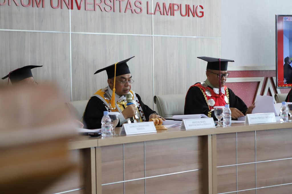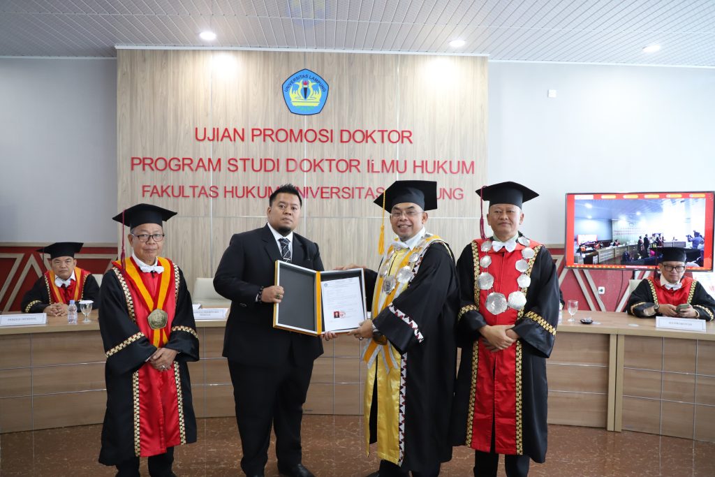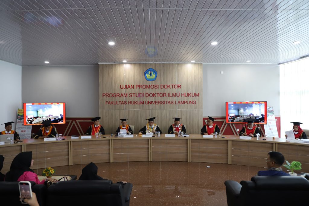 Ujian terbuka dipimpin langsung Wakil Rektor IV Unila, Prof. Dr. Ayi Ahadiat, S.E., M.B.A., dan turut dihadiri Dekan FH Unila Dr. M. Fakih, S.H., M.S., serta tim penguji yang terdiri dari Dr. Tedi Nopriadi, S.H., M.H. (Penguji Eksternal), Prof. Dr. Maroni, S.H., M.Hum., Prof. Dr. HS. Tisnanta, S.H., M.H., Prof. Dr. FX. Sumarja, S.H., M.Hum., dan Dr. M. Fakih, S.H., M.S. (Penguji Internal), Prof. Dr. Muhammad Akib, S.H., M.Hum. (Sekretaris Penguji sekaligus Ketua Program Studi Doktor Ilmu Hukum), Dr. Erna Dewi, S.H., M.H, selaku (promotor),serta Dr. A. Irzal Fardiansyah, S.H., M.H. (Ko-Promotor/Unila).