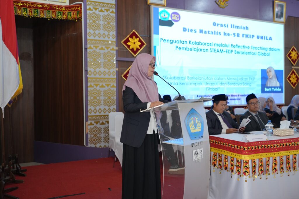 Sebagai bagian dari agenda puncak dies natalis ke-58, sesi orasi ilmiah disampaikan Dr. Berti Yolida, M.Pd., Dosen Program Studi Pendidikan Biologi FKIP Unila, dengan judul “Penguatan Kolaborasi Melalui Reflective Teaching dalam Pembelajaran STEAM-EDP Berorientasi Global”.