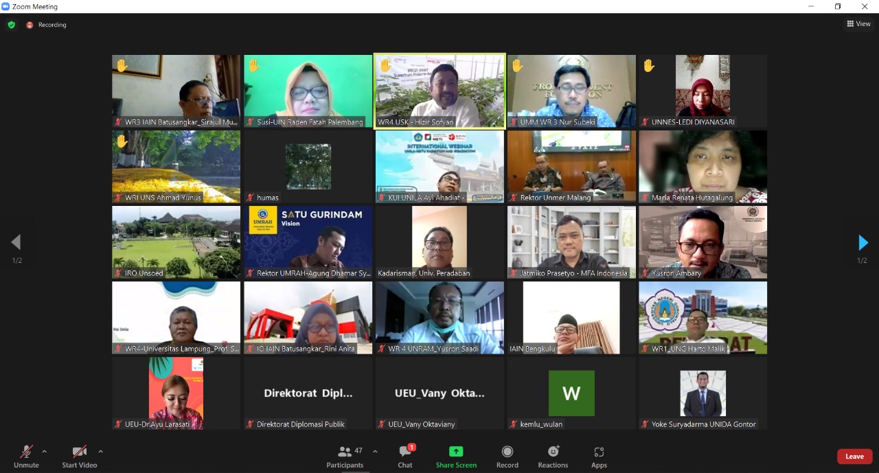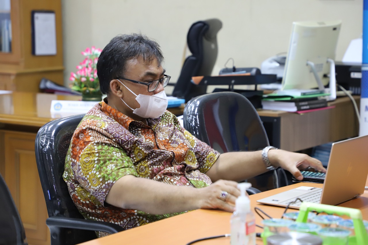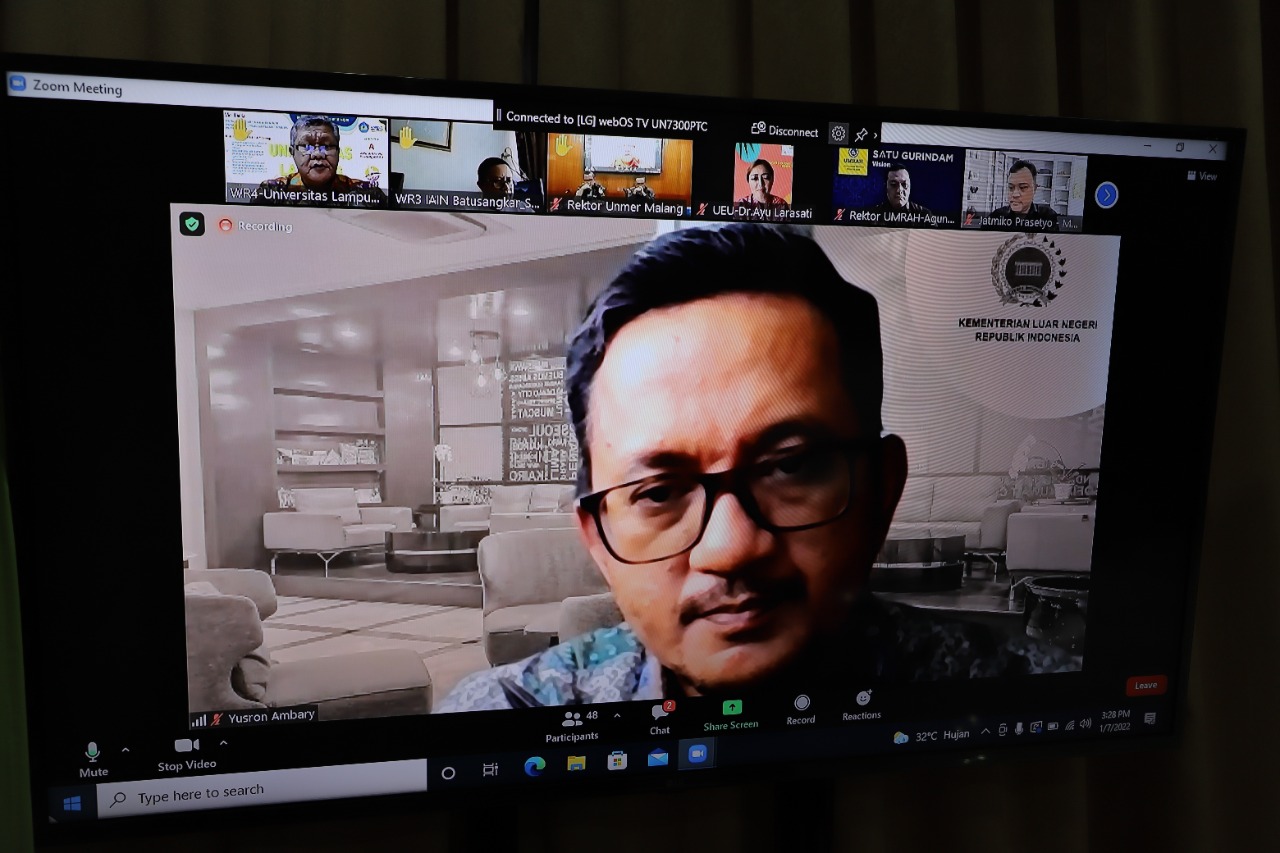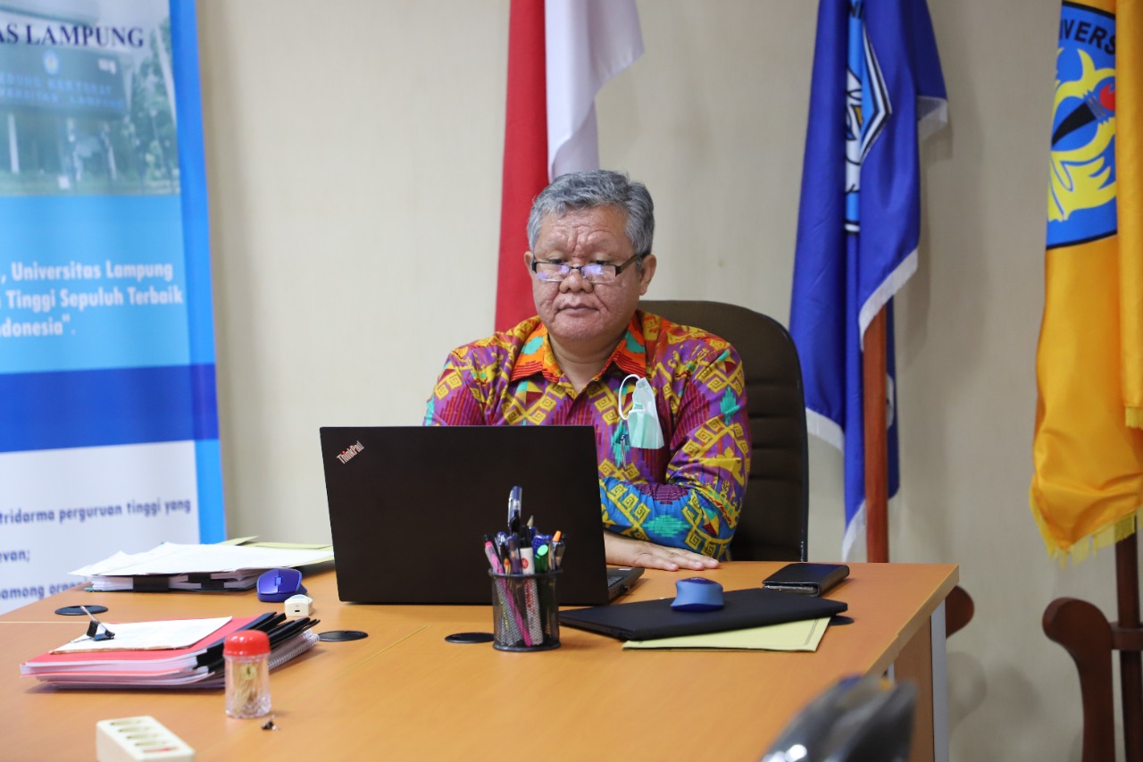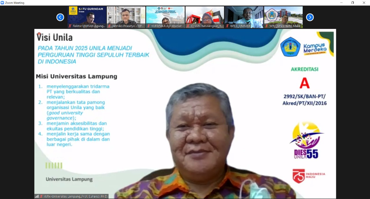 (Unila): Wakil Rektor Bidang Perencanaan, Kerja sama, dan TIK Universitas Lampung (Unila) Prof. Ir. Suharso, S.Si., Ph.D., menghadiri rapat Rencana Kerja Sama Beasiswa Pendidikan Tinggi kepada Mahasiswa Perempuan Afganistan via aplikasi Zoom, Jumat, 7 Januari 2022.