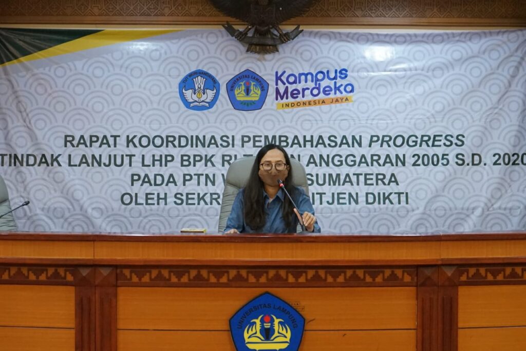 (Unila): Wakil Rektor Bidang Umum dan Keuangan (BUK) Universitas Lampung (Unila) Prof. Dr. dr. Asep Sukohar, S.Ked., M.Kes., membuka rapat koordinasi Pembahasan Progres Tindak Lanjut LHP BPK RI Tahun Anggaran 2005-2020, Kamis, 17 Juni 2021, di Ruang Sidang lantai 2 Gedung Rektorat Unila.