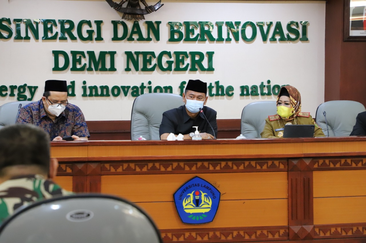 Jelang pelaksanaan kegiatan, Wakil Rektor Bidang Umum dan Keuangan Unila Prof. Dr. dr. Asep Sukohar, S.Ked., M.Kes., yang juga koordinator kesehatan kegiatan muktamar menggelar rapat koordinasi daerah pemangku kebijakan kesehatan, di ruang sidang utama lantai 2 Rektorat Unila, Selasa, 14 Desember 2021.