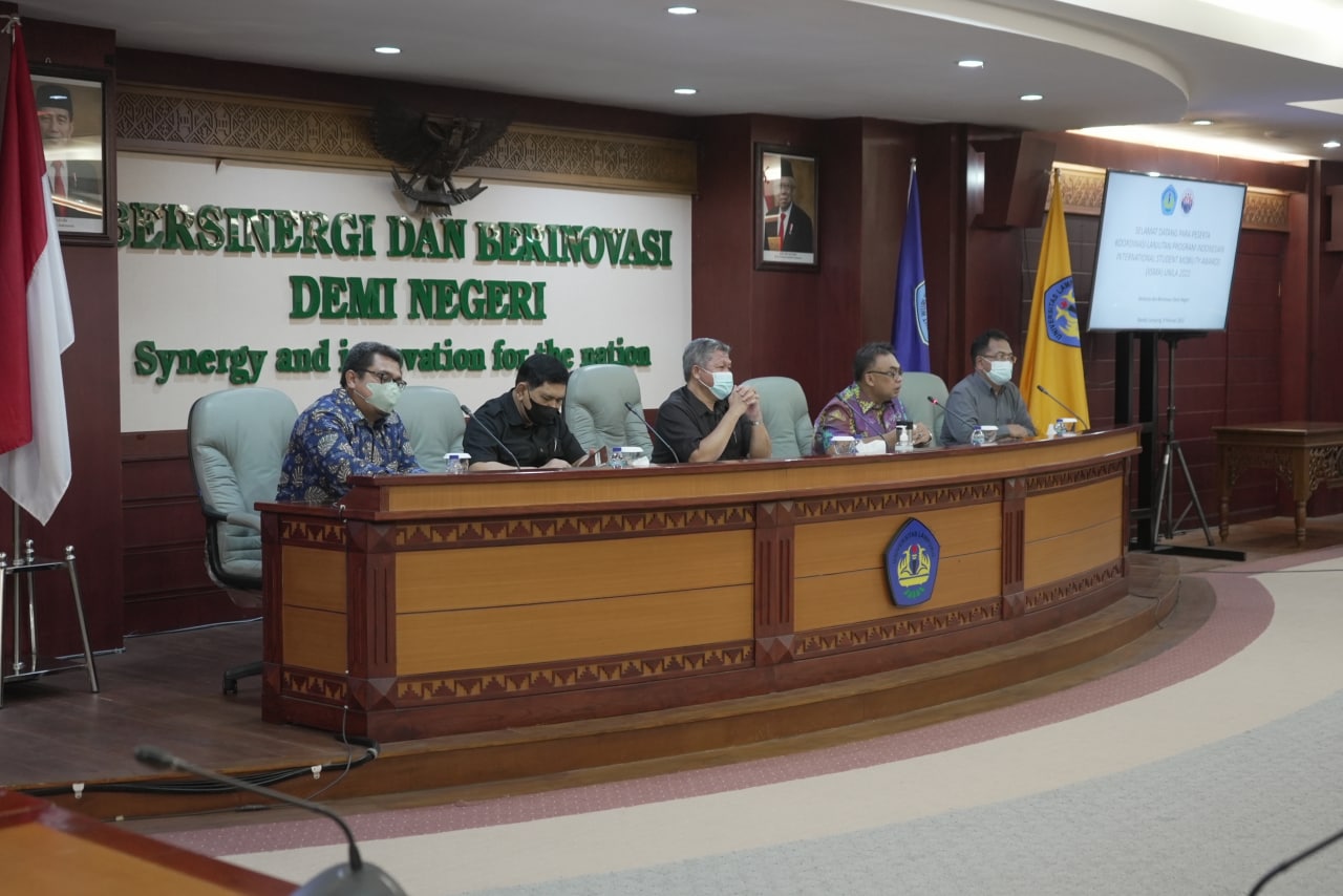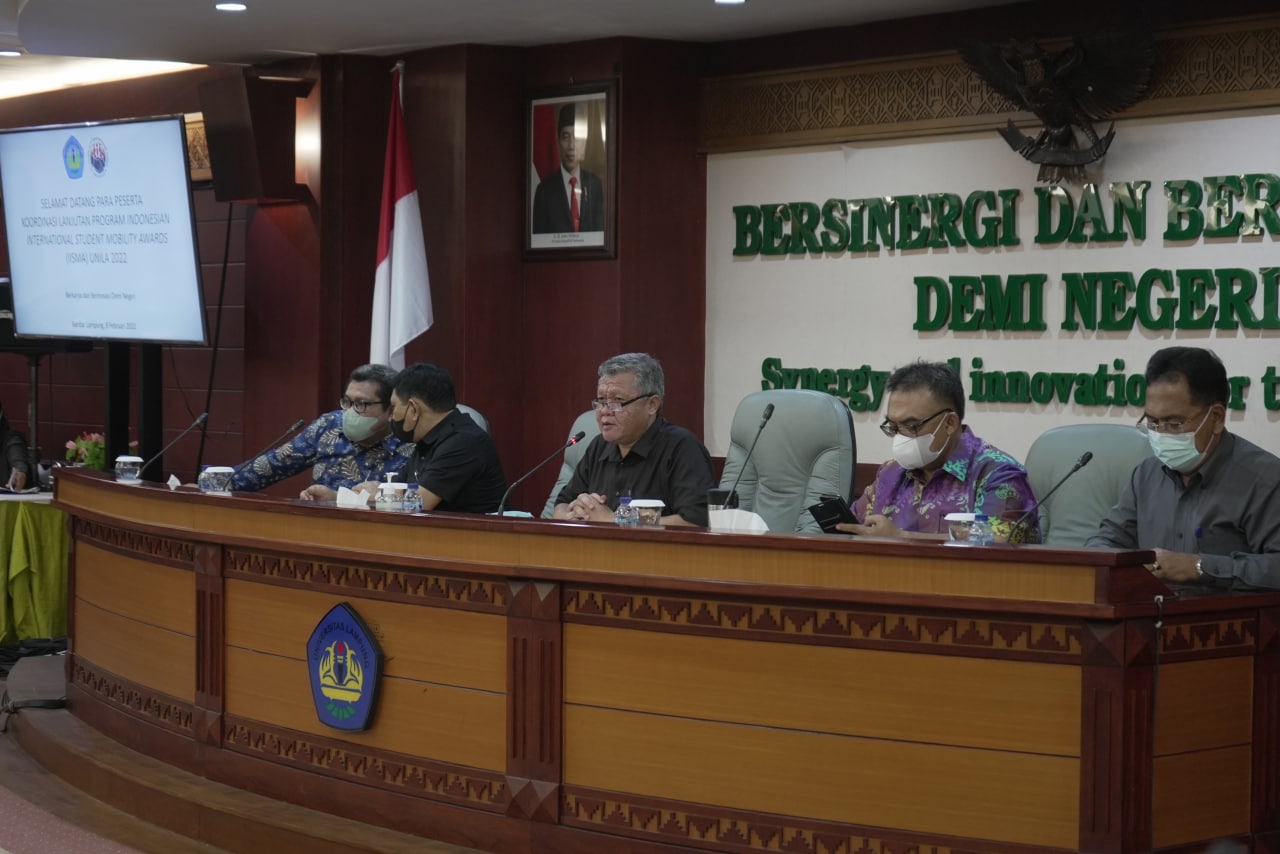(Unila): Universitas Lampung (Unila) menggelar koordinasi lanjutan persiapan keikutsertaan mahasiswanya pada Program Indonesian International Student Mobility Awards (IISMA) tahun 2022. Koordinasi berlangsung di ruang sidang utama lantai 2 Rektorat, Selasa, 8 Februari 2022.