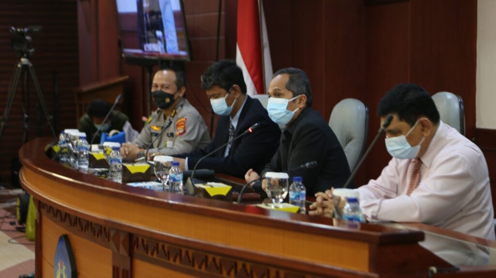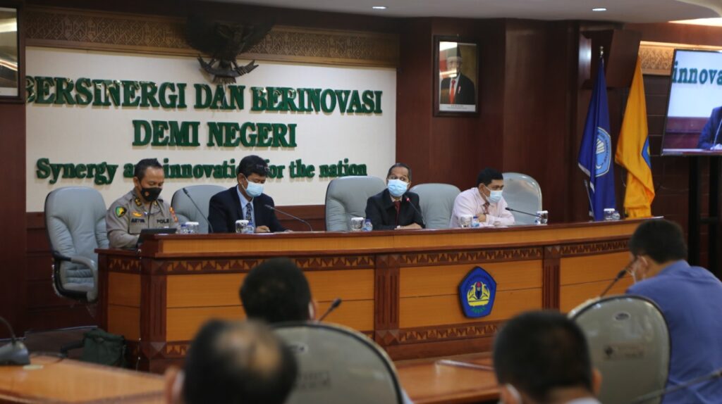 (Unila): Rektor Universitas Lampung (Unila) Prof. Dr. Karomani M.Si., memimpin rapat vaksinasi Covid-19 bagi dosen, tenaga kependidikan, dan mahasiswa di lingkungan Unila. Kegiatan berlangsung di ruang sidang utama lantai 2 Rektorat, Senin, 21 Juni 2021.