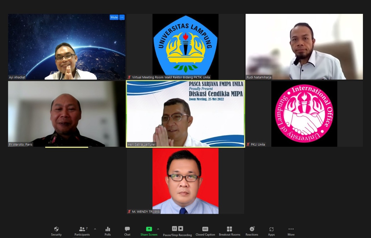 (Unila): Unit Pelaksana Teknis Pengembangan Kerja sama dan Layanan Internasional (UPT PKLI) Universitas Lampung (Unila) menggelar rapat secara daring melalui aplikasi Zoom Meeting, Rabu, 25 Mei 2022.