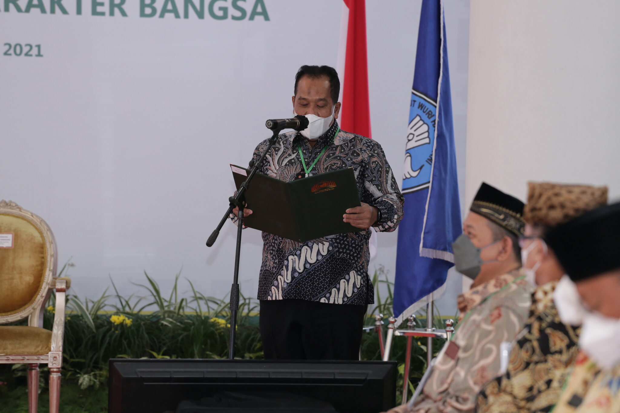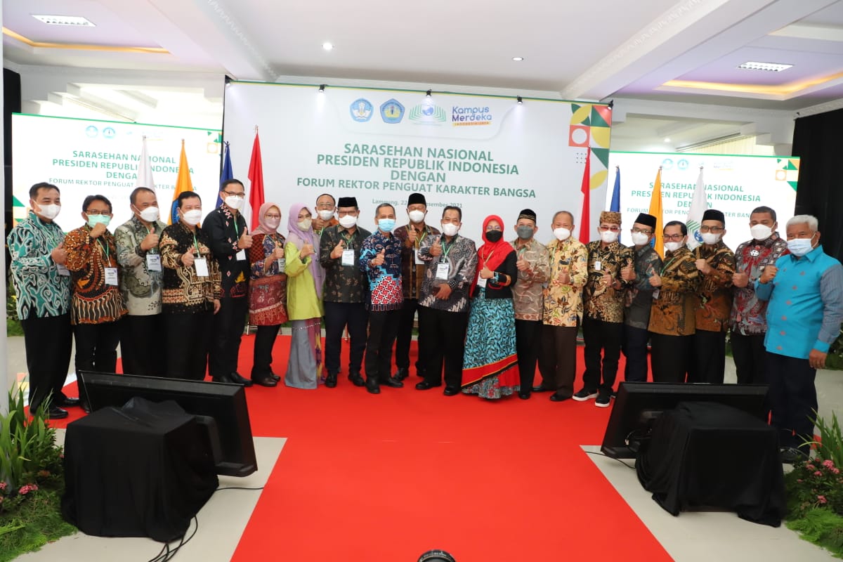 (Unila): Rektor Universitas Lampung (Unila) Prof. Dr. Karomani, M.Si., membuka kegiatan Sarasehan Nasional Forum Rektor Penguat Karakter Bangsa (FRPKB), Rabu, 22 Desember 2021. Pembukaan sarasehan dilaksanakan secara hybrid, di Gedung Student Center FEB Unila dan video conference Zoom.