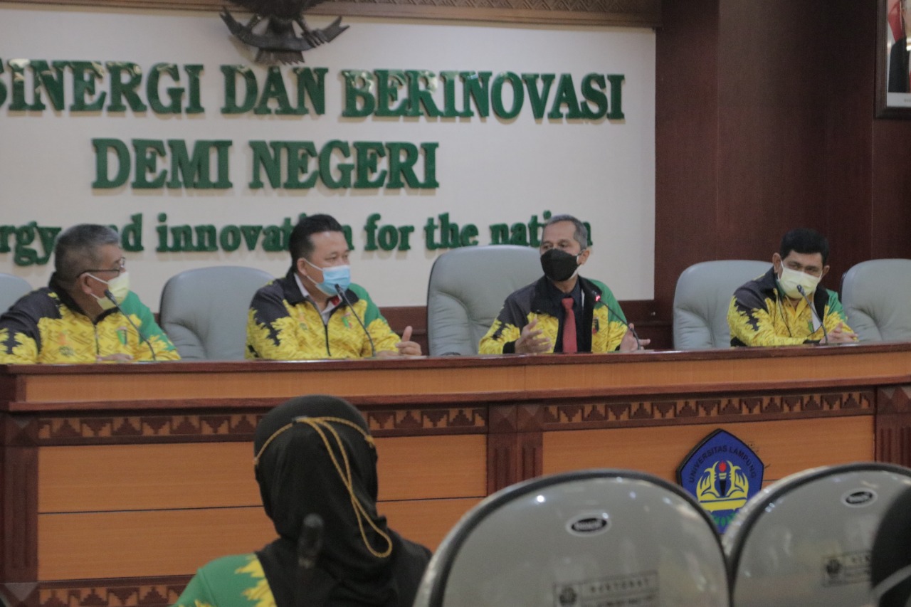 Kegiatan turut dihadiri Wakil Rektor Bidang Kemahasiswaan dan Alumni Unila Prof. Dr. Yulianto, M.S., didampingi Ketua Senat Muhammad Basri, S.Pd., M.Pd., dan para ketua bidang satuan tugas PON XX Papua 2021.