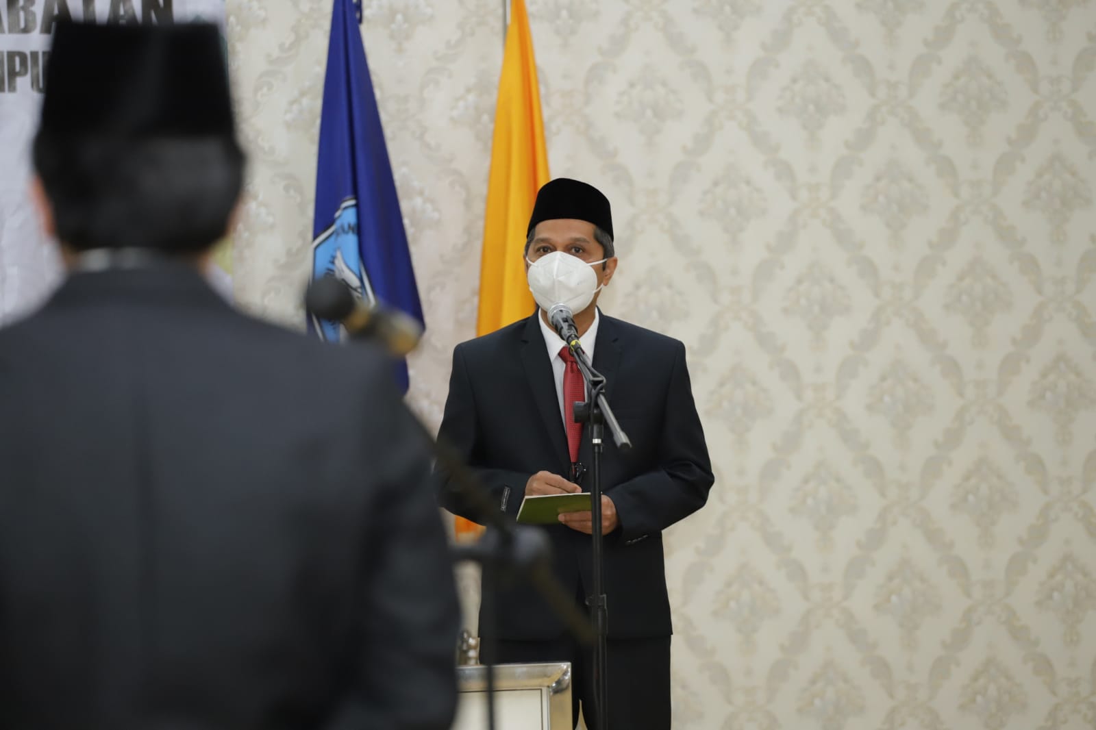 (Unila): Rektor Universitas Lampung (Unila) Prof. Dr. Karomani, M.Si., melantik Dekan Fakultas Teknik (FT) Dr. Eng. Helmy Fitriawan, S.T., M.Sc., di Aula Pelantikan Rektorat lantai 4, Senin, 6 Desember 2021.