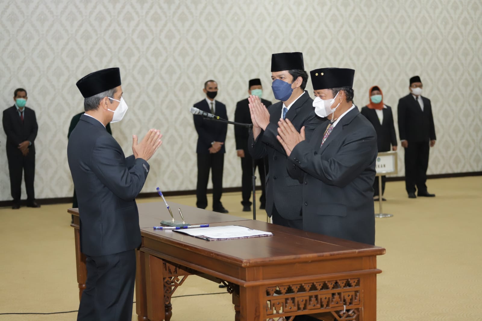 Pelantikan dan serah terima jabatan diselenggarakan dengan tetap menerapkan protokol pencegahan Covid-19 dan ditayangkan langsung melalui aplikasi Zoom.