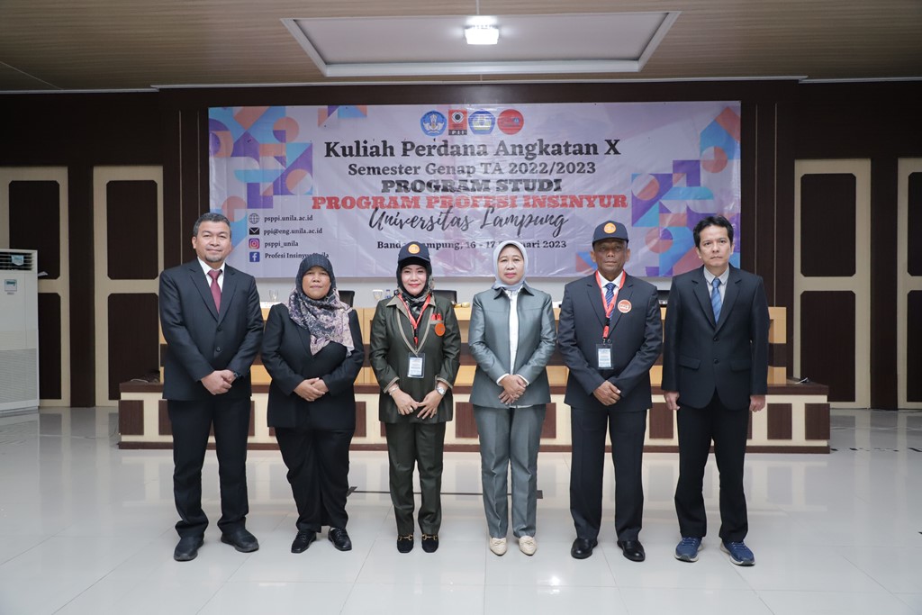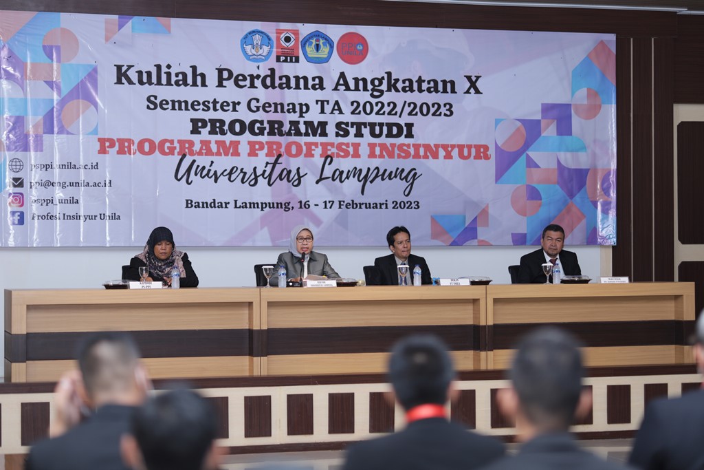 Rektor Universitas Lampung (Unila) Prof. Dr. Ir. Lusmeilia Afriani, D.E.A., IPM., secara resmi membuka Kuliah Perdana Angkatan X Pogram Studi Program Profesi Insinyur (PSPPI), di Aula Fakultas Teknik Unila, Jumat, 17 Februari 2023.