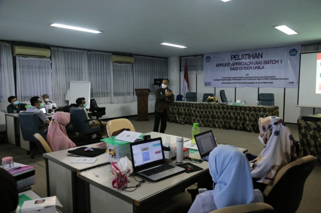 (Unila): Rektor Universitas Lampung (Unila) Prof. Dr. Karomani, M.Si., menjadi narasumber pada Pelatihan Applied Approach (AA) dengan topik “Kebijakan Pengembangan Profesionalisme Dosen dalam Pelaksanaan Mutu Pembelajaran”, Senin 22 Maret 2021.