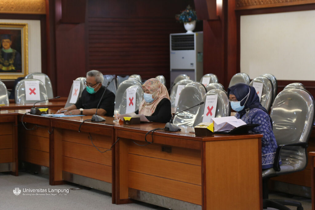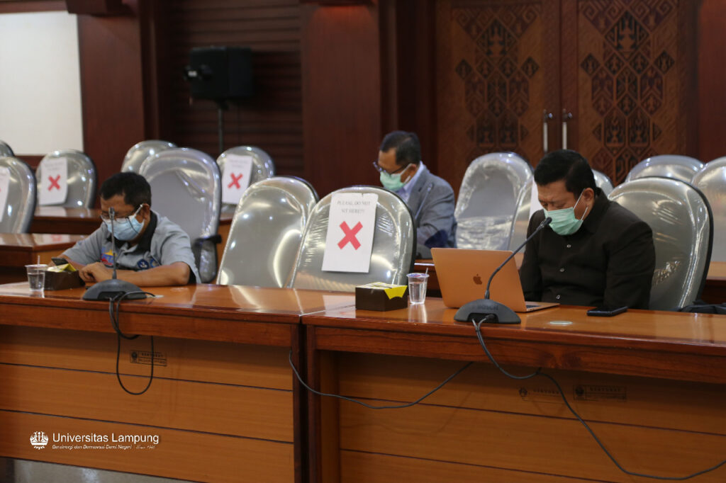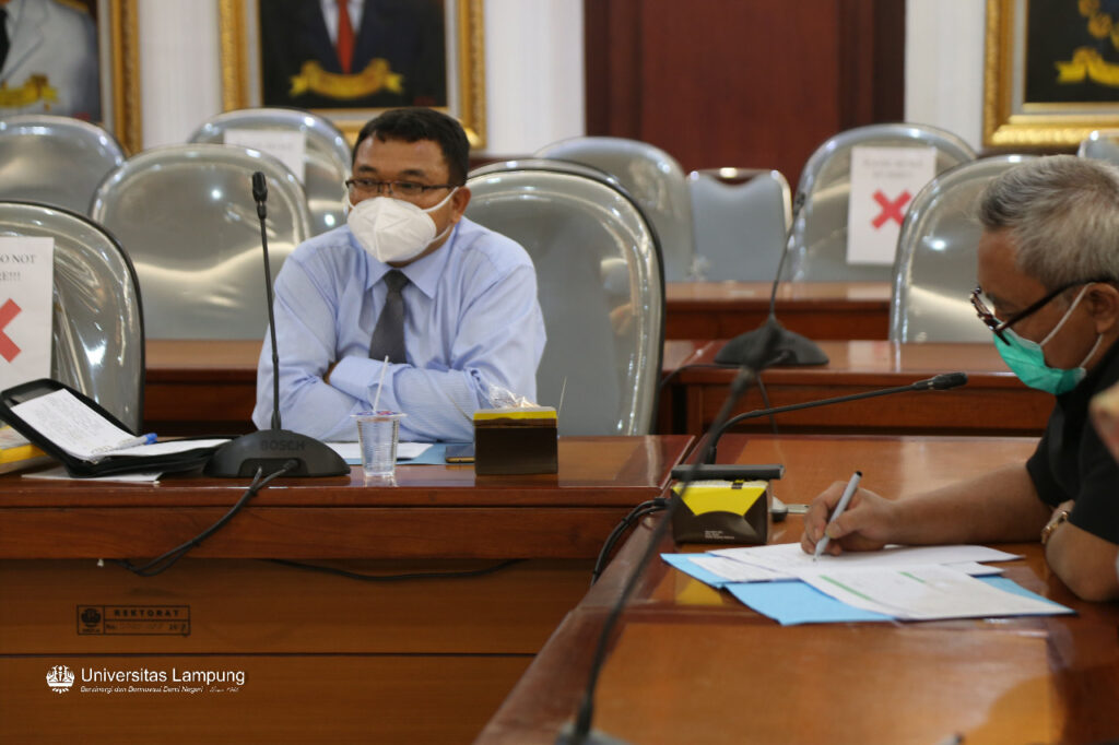 (Unila): Rektor Universitas Lampung (Unila) Prof. Dr. Karomani, M.Si., memimpin rapat rutin pimpinan Universitas Lampung, Selasa, 2 Februari 2021. Kegiatan yang berlangsung di ruang sidang utama lantai 2 Rektorat ini diikuti para wakil rektor, direktur pascasarjana, dan para dekan di lingkungan kampus setempat. []