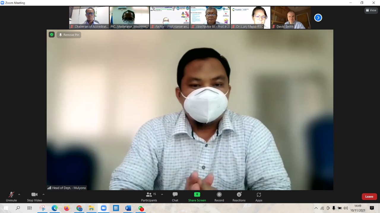 (Unila): Rektor Universitas Lampung (Unila) Prof. Dr. Karomani, M.Si., menyambut asesor dan tim dari Lembaga Internasional Royal Society of Chemistry (RSC) dalam proses visitasi akreditasi internasional, Rabu, 10 November 2021.