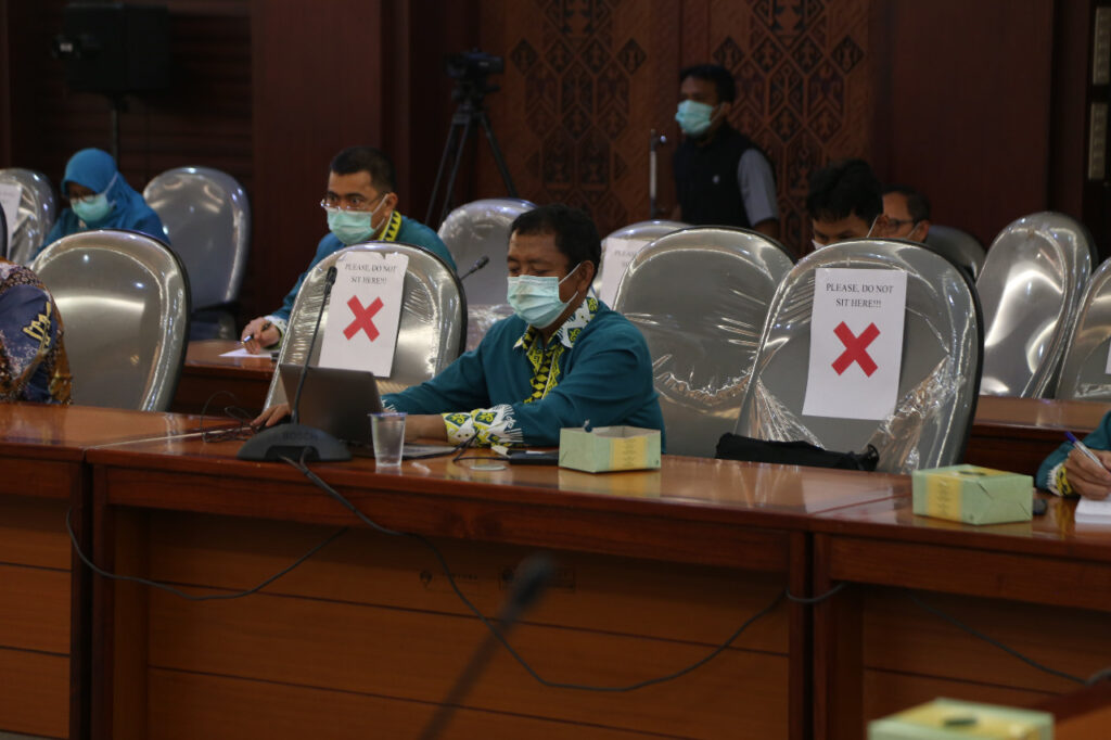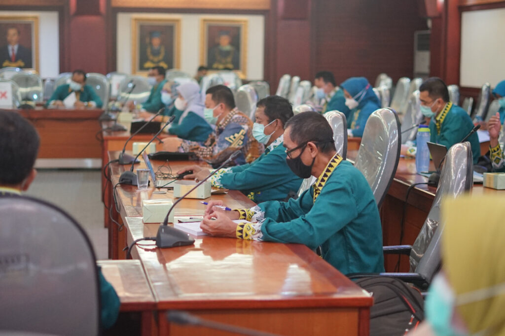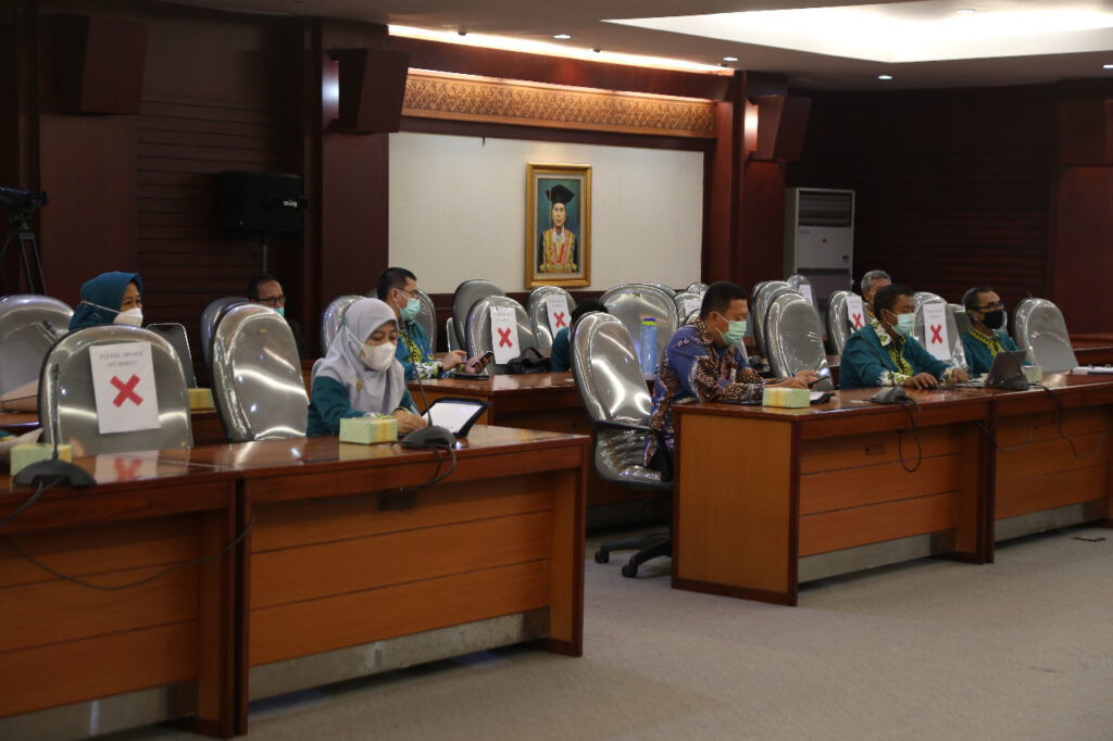 Simbolis serah terima disaksikan jajaran pimpinan kampus di ruang sidang lantai 2 Rektorat, dan secara daring melalui aplikasi Zoom.