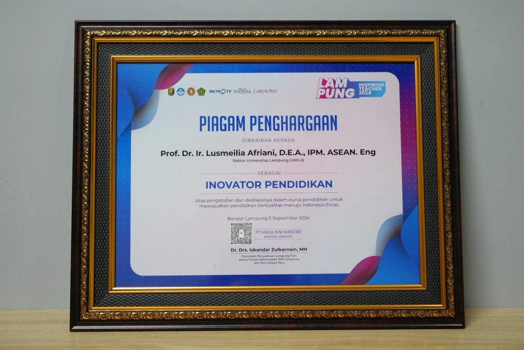 (Unila): Rektor Universitas Lampung (Unila) Prof. Dr. Ir. Lusmeilia Afriani, D.E.A., IPM., ASEAN Eng., menerima penghargaan sebagai Inovator Pendidikan pada acara Lampung Inspiring Teacher 2024, yang berlangsung Selasa, 3 September 2024.