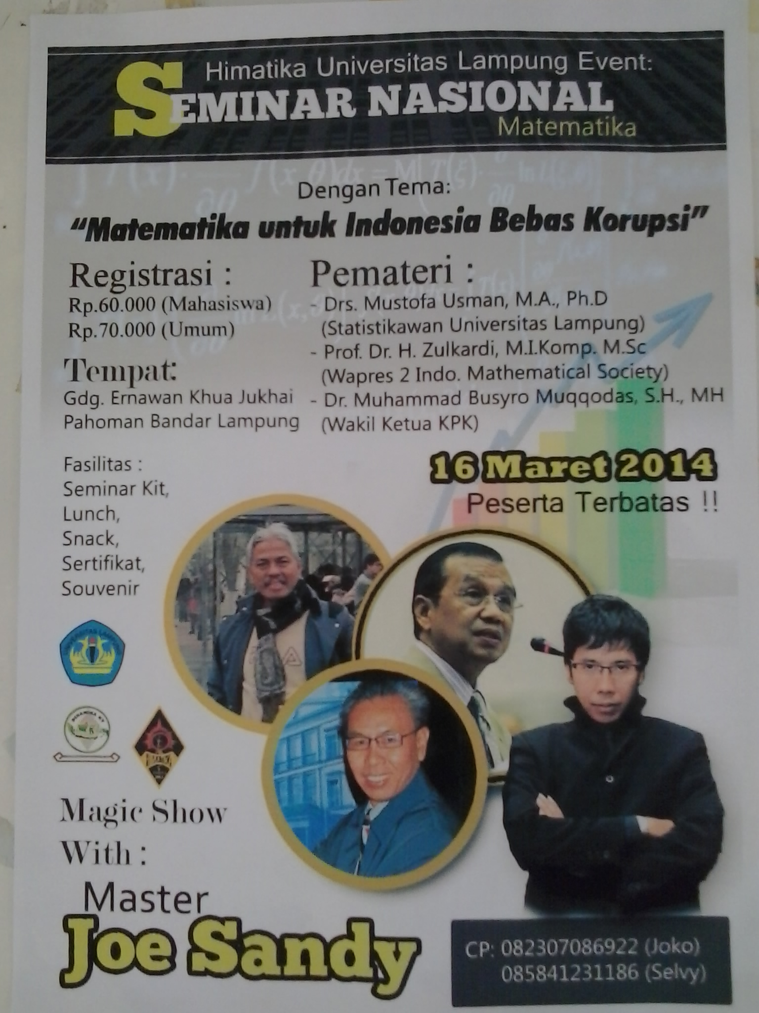 “Pembicara sudah fix. Ya, seminar nasional 16 Maret. Materinya, akan dibahas terkait keadaan korupsi di Indonesia oleh KPK. Lalu, akan dilanjutkan pembahasan penerapan ilmu matematika dan statistika,” terang Selvy, salah satu panitia kegiatan ini.
