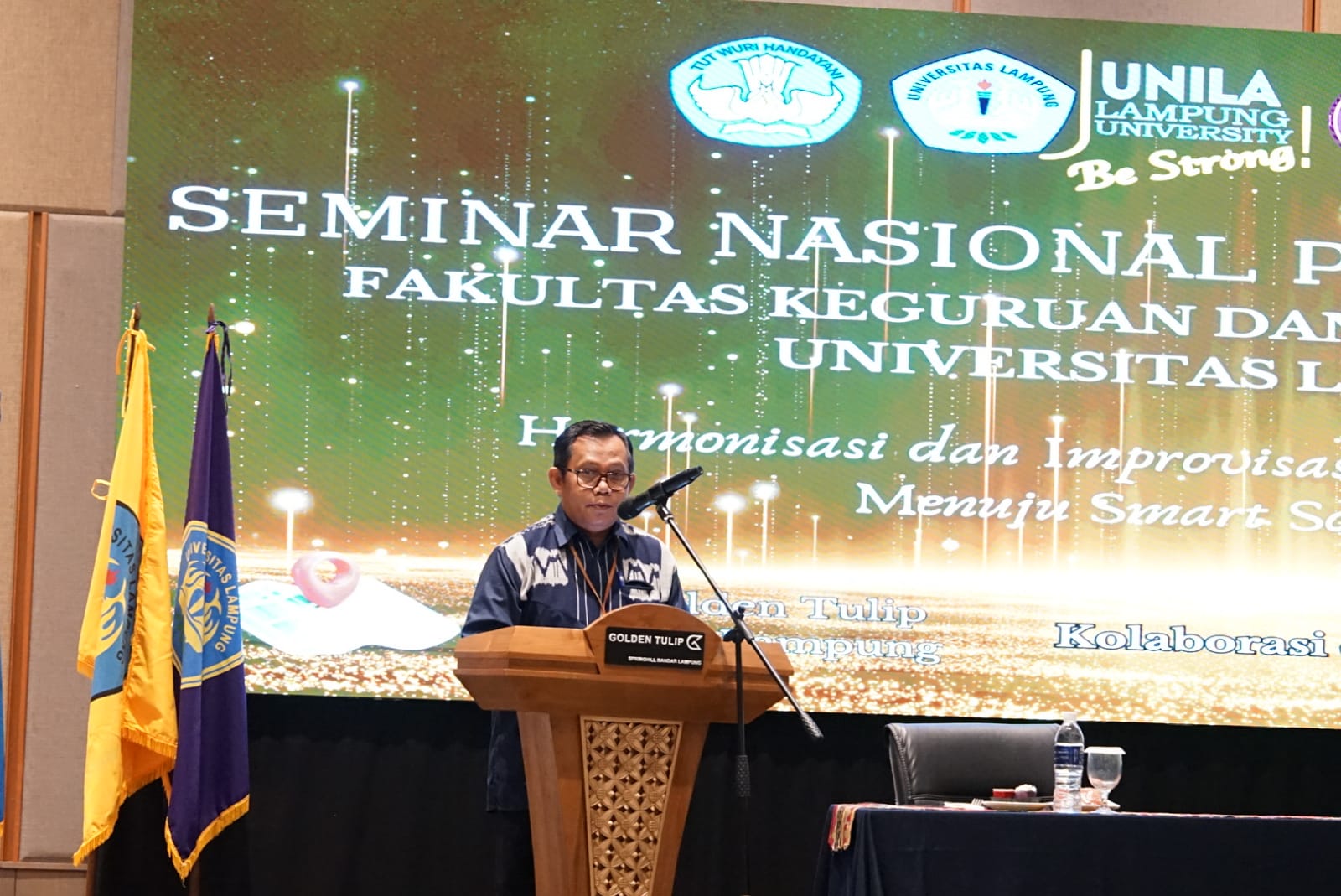 Sambutan selanjutnya disampaikan Dekan FKIP Unila Prof. Dr. Sunyono, M.Si., yang menjelaskan bahwa seminar nasional ini merupakan bagian dari perayaan dies natalis ke-56 FKIP Unila yang dilaksanakan setiap tahun.
