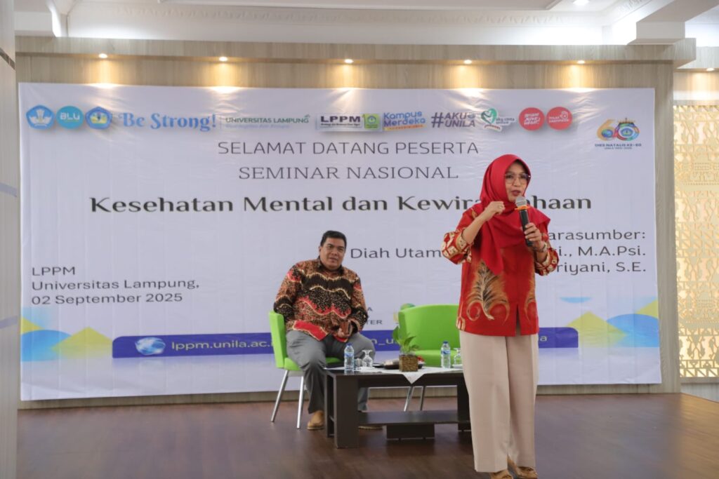 (Unila): Rektor Universitas Lampung (Unila), Prof. Dr. Ir. Lusmeilia Afriani, D.E.A., IPM., membuka seminar nasional dengan tema “Kesehatan Mental dan Kewirausahaan” bersama Ikatan Keluarga Purnabakti Unila (IKPA) dalam rangka Hari Ulang Tahun (HUT) IKPA ke-7 pada 2 September 2025, di Perpustakaan Fakultas Ekonomi dan Bisnis (FEB) Unila.