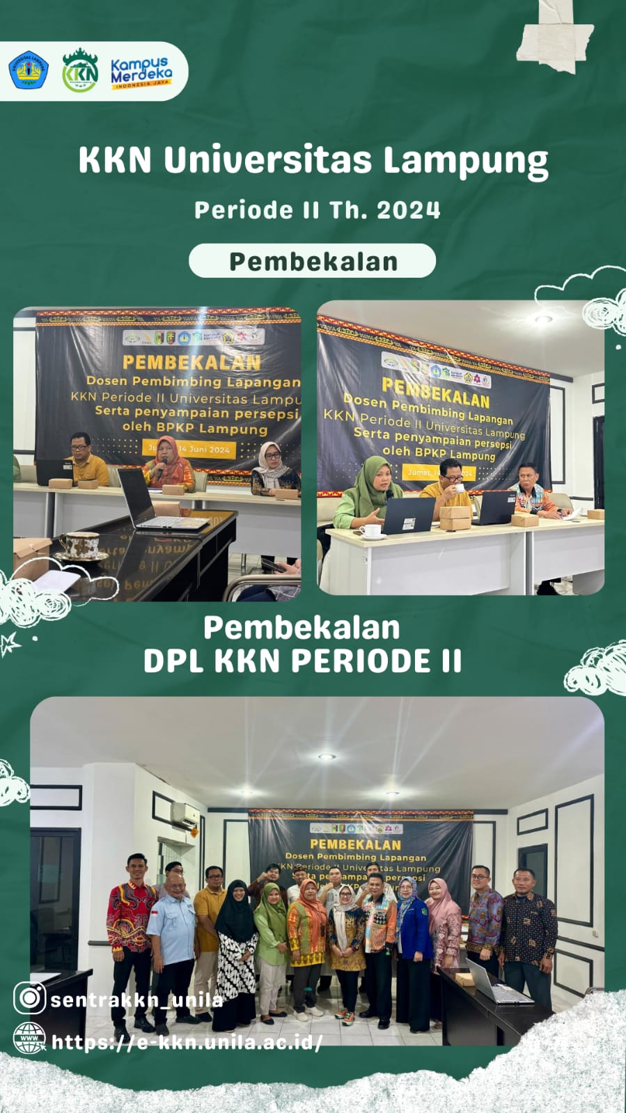 (Unila): Sentra Kuliah Kerja Nyata (KKN) Unila menggelar pembekalan kepada Dosen Pembimbing Lapangan (DPL) KKN Unila, Jumat, 14 Juni 2024. Kegiatan ini turut menggandeng perwakilan Badan Pengawasan Keuangan dan Pembangunan (BPKP) Provinsi Lampung.