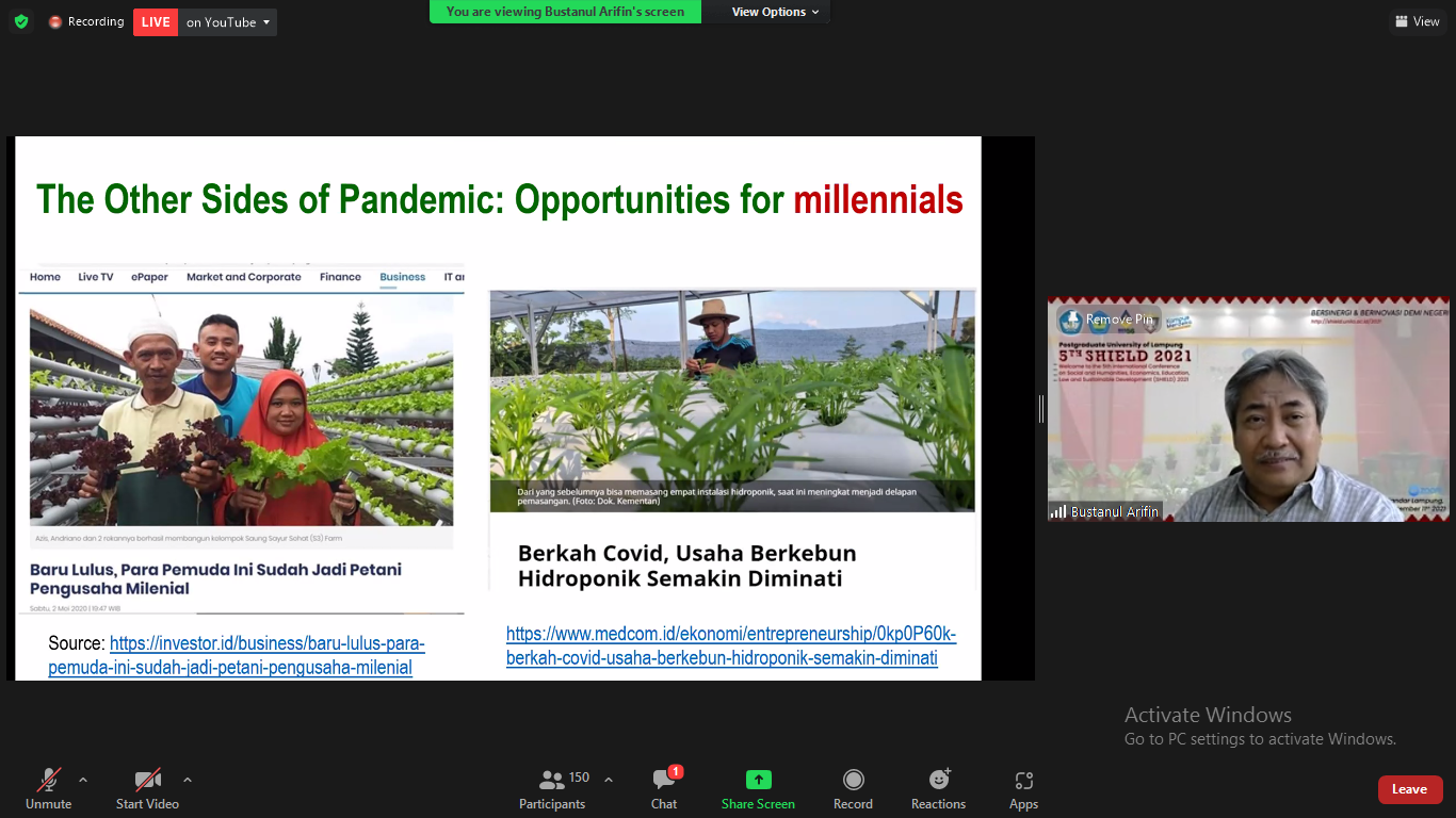 Konferensi bertajuk “Sustainable Development During and Post Pandemic” ini diselenggarakan offline di Gedung Pascasarjana lantai I kampus setempat dan secara daring via aplikasi Zoom, Sabtu, 11 September 2021.