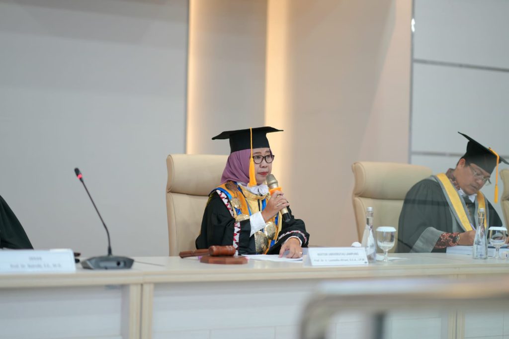 Sidang terbuka dibuka Rektor Unila Prof. Dr. Ir. Lusmeilia Afriani, D.E.A., IPM., ASEAN Eng., yang juga bertindak sebagai Ketua Tim Penguji.
