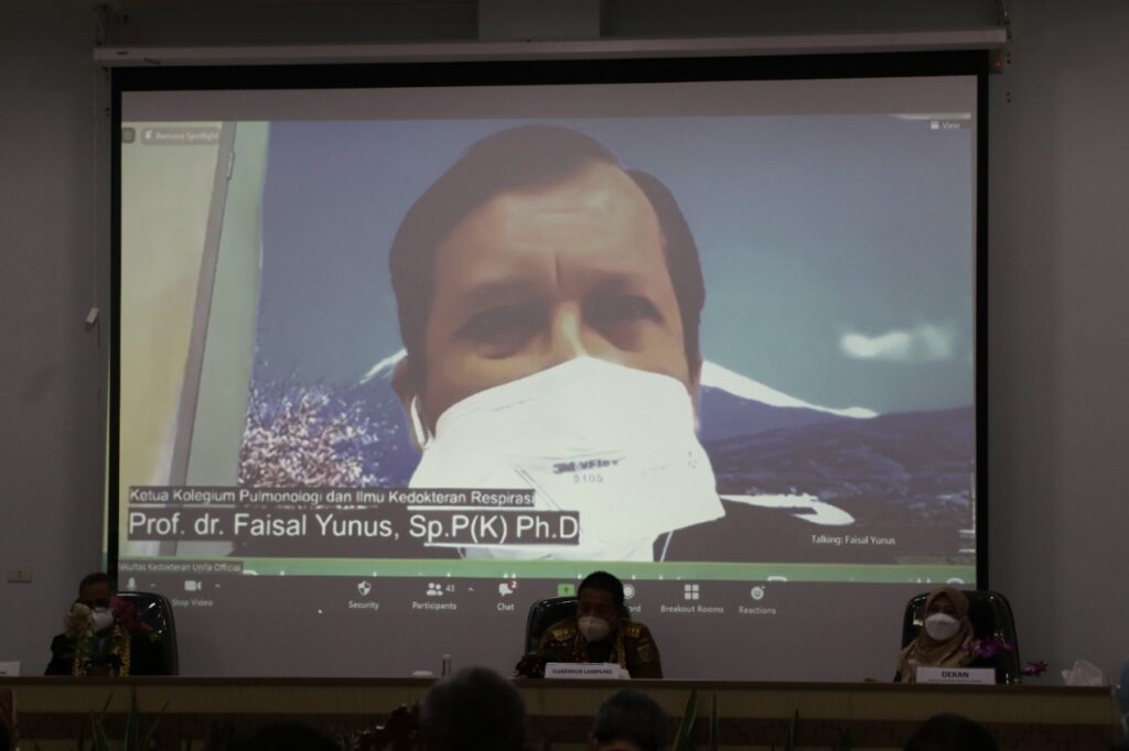 Ketua Kolegium Pulmonologi dan Ilmu Respirasi Prof. dr. Faisal Yunus, Sp.P(K)., Ph.D., saat sambutan secara daring mengapresiasi pemerintah dan Unila atas upaya mendukung berdirinya PPDS khususnya, pulmonologi dan ilmu respirasi ini.