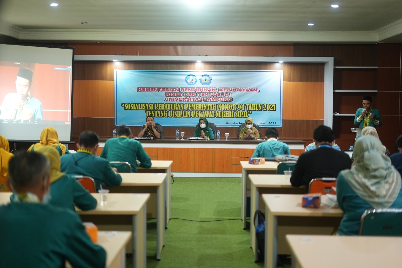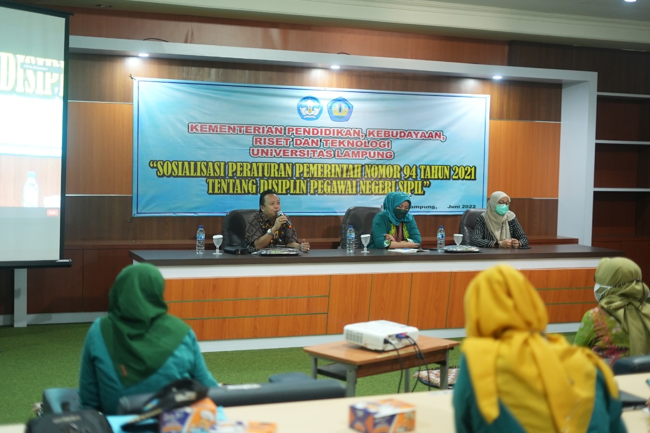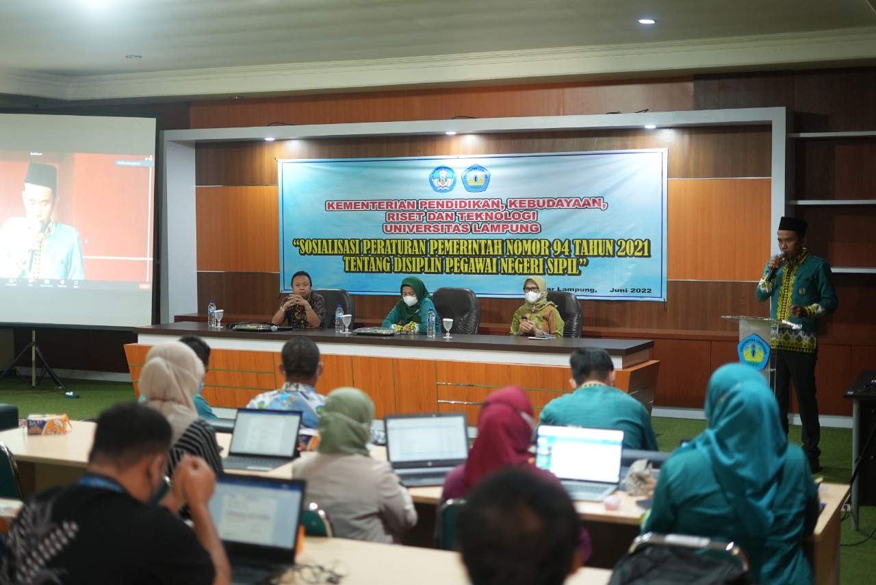 (Unila): Biro Umum dan Kepegawaian (BUK) Universitas Lampung (Unila) menggelar Sosialisasi Peraturan Pemerintah (PP) Nomor 94 Tahun 2021 tentang Disiplin Pegawai Negeri Sipil, di Gedung Perpustakaan lantai 3 kampus setempat, Kamis, 23 Juni 2022.