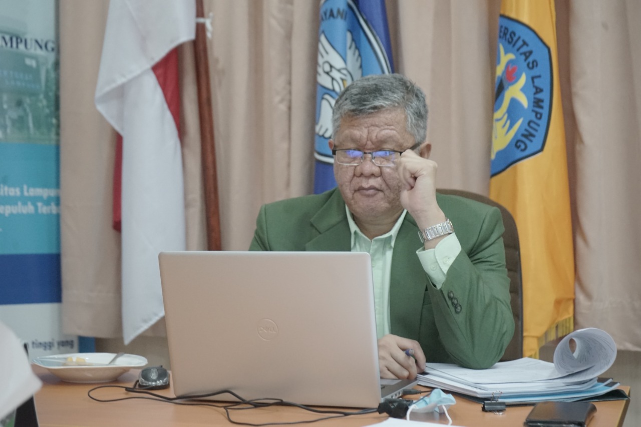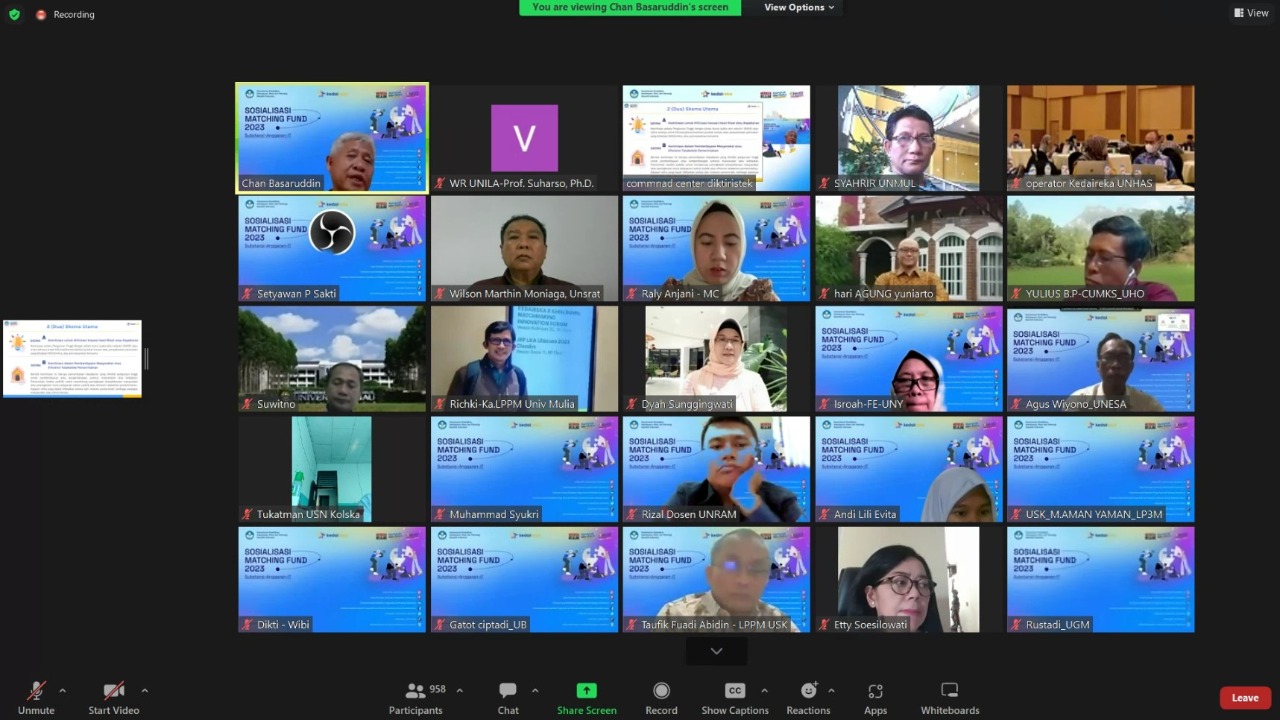 (Unila): Wakil Rektor Bidang Perencanaan, Kerja Sama, dan TIK Universitas Lampung (Unila) Prof. Ir. Suharso, Ph.D., menghadiri Sosialisasi Program Matching Fund Tahun 2023 yang diselenggarakan Direktorat Jenderal Pendidikan Tinggi (Ditjen Dikti) secara daring, Rabu, 21 Desember 2022.