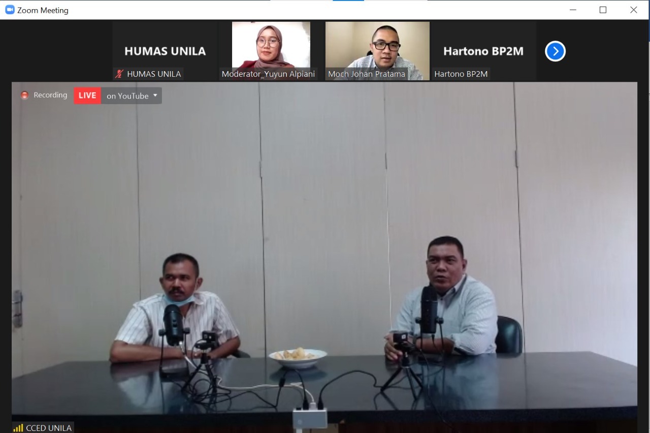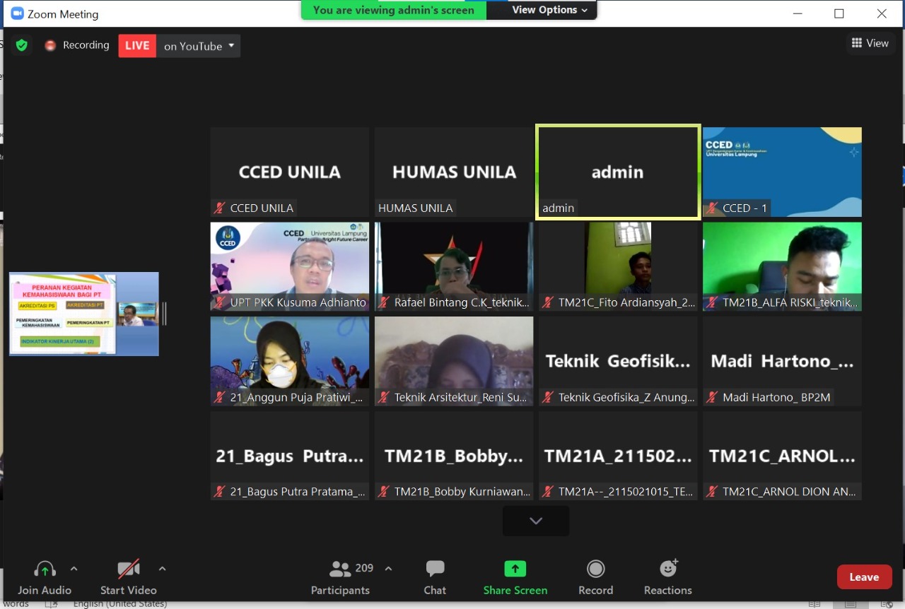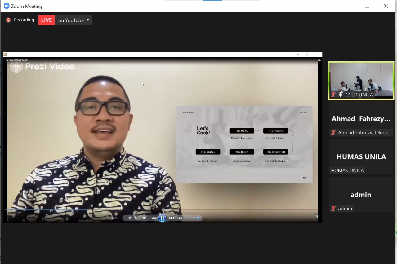 Kegiatan diselenggarakan Bagian Kemahasiswaan Unila bekerja sama dengan Center for Career and Entrepreneurship Development (CCED) Unila secara daring via Zoom dan Youtube.