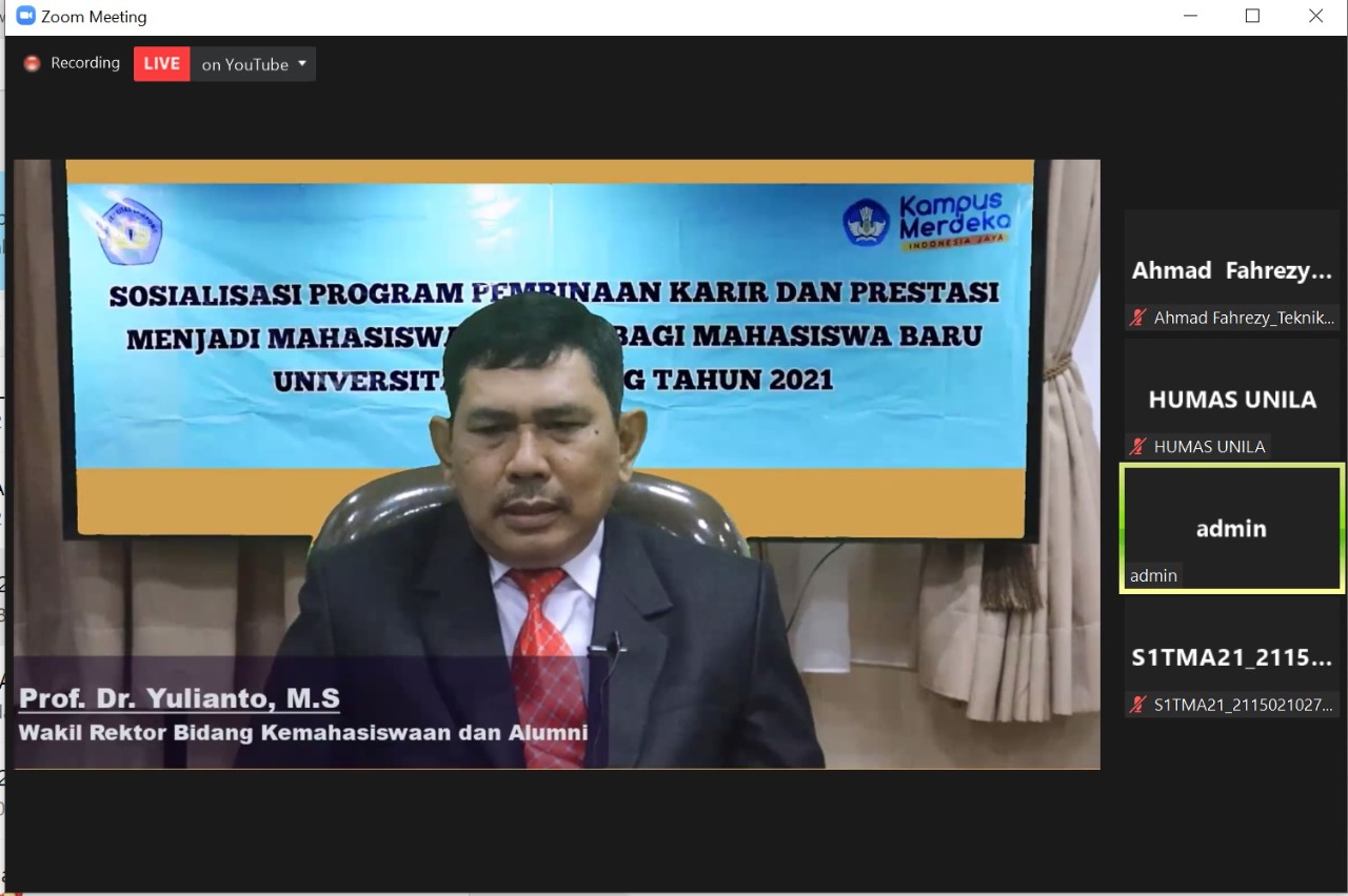 (Unila): Wakil Rektor Bidang Kemahasiswaan dan Alumni Universitas Lampung (Unila) Prof. Dr. Yulianto, M.S., membuka kegiatan Sosialisasi Program Pembinaan Karir dan Prestasi Menjadi Mahasiswa Unggul bagi Mahasiwa Baru Unila tahun 2021, Sabtu, 18 September 2021.
