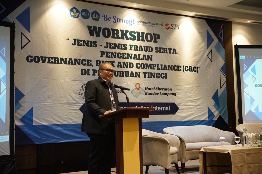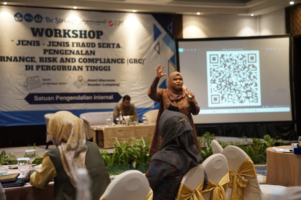 (Unila): Satuan Pengendalian Internal (SPI) Universitas Lampung (Unila) mengadakan workshop pengenalan jenis-jenis fraud dan sanksinya serta pengenalan governance, risk, and compliance (GRC) terkait pengendalian internal dan kepatuhan, di Hotel Sheraton Lampung, Senin, 21 Oktober 2024.