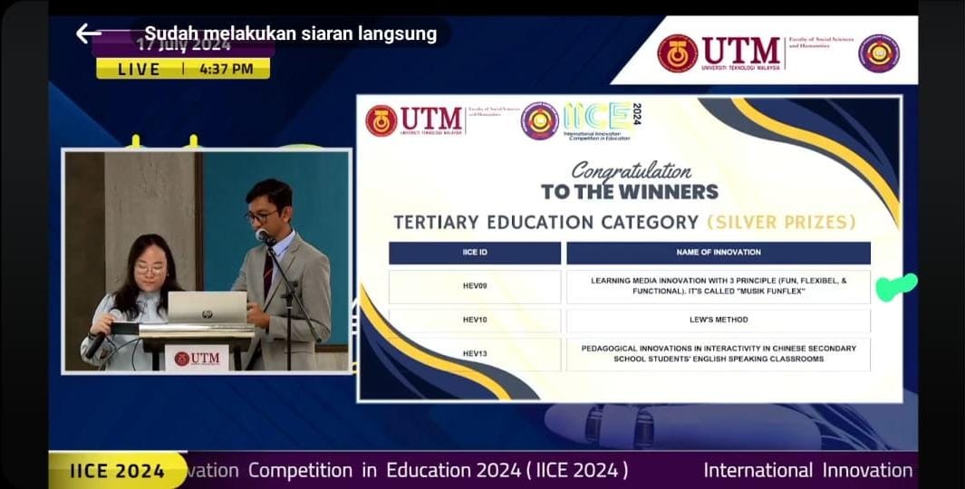 Tiga mahasiswa tersebut berhasil meraih medali perak (Silver Medal) pada ajang International Innovation Competition in Education (IICE) yang diselenggarakan secara daring (online) pada Rabu, 17 Juli 2024, oleh Persatuan Pendidikan Sains dan Matematik Johor (PPSMJ) bekerja sama dengan FSSH (Faculty of Social Sciences and Humanities) Universiti Teknologi Malaysia (UTM) dengan tema “STEAM Education for an Innovative Society”.