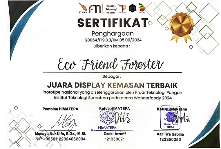 (Unila): Tim Eco Friend yang terdiri dari tiga mahasiswa Program Studi Kehutanan Fakultas Pertanian Universitas Lampung (Unila) berhasil mengantongi tiga kemenangan dalam Kompetisi Inovasi Produk Prototipe Nasional yang diselenggarakan Program Studi Teknologi Pangan Institut Teknologi Sumatera.