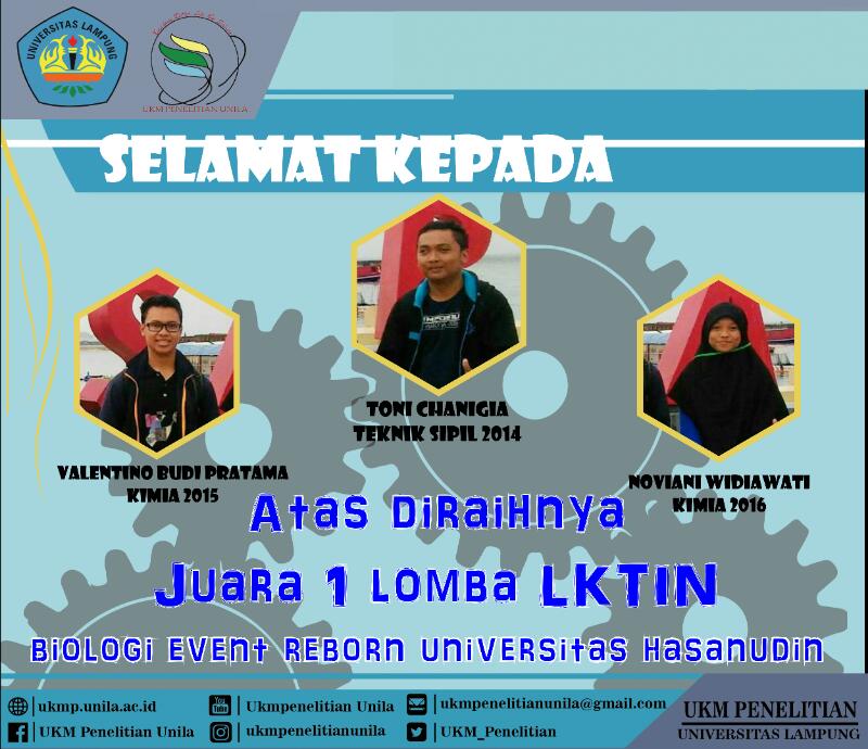 Tiga mahasiswa Universitas Lampung membawa pulang juara pertama LKTIN Biologi Event Reborn yang di adakan di Universitas Hasanudin, ketiga mahasiswa tersebut ialah Valentino Budi Pratama (kimia 2015), Toni Chanigia (teknik sipil 2014),Noviani Widiawati (kimia 2016).