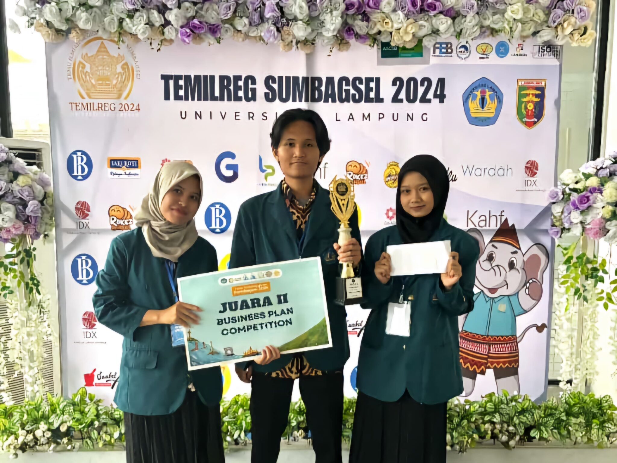 (Unila): Tim mahasiswa Universitas Lampung (Unila) berhasil meraih juara 2 dalam kompetisi Business Plan di Temu Ilmiah Regional (Temilreg), Sumatra bagian Selatan (Sumbagsel), 2024, yang diadakan di Unila sebagai tuan rumah.