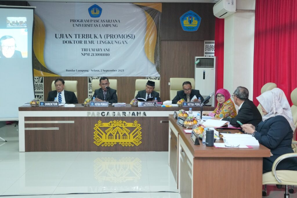 (Unila): Pascasarjana Universitas Lampung (Unila) kembali menorehkan prestasi akademik dengan lahirnya doktor baru. Tri Umaryani secara resmi dikukuhkan sebagai doktor setelah berhasil mempertahankan disertasi dalam Sidang terbuka promosi doktor yang digelar pada Selasa, 2 September 2025, di Aula Pascasarjana Unila.