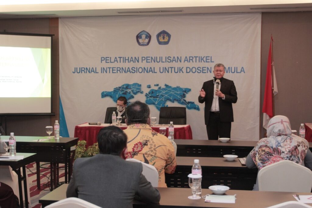 Wakil Rektor Bidang Perencanaan, Kerja sama, dan TIK Unila Prof. Suharso, Ph.D., yang hadir sebagai narasumber, menyampaikan materi “Motivasi dan Kiat sebagai Penulis Pemula untuk Publikasi Jurnal Internasional”.