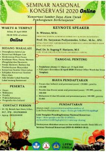 AgendaPengumuman Undangan Semnas Konservasi 2020 Online Di update oleh Siti Nuryani - 13/04/2020 0 1458 https://fmipa.unila.ac.id/undangan-seminar-nasional-daring/