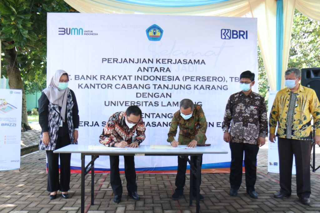 (Unila): Rektor Universitas Lampung (Unila) Prof. Dr. Karomani, M.Si., dan Kepala Cabang PT. Bank Rakyat Indonesia (Persero) Tbk Tanjungkarang Anton Purnomo menandatangani Perjanjian Kerja Sama (PKS) Pemasangan Mesin EDC sekaligus peluncuran BRIZZI.