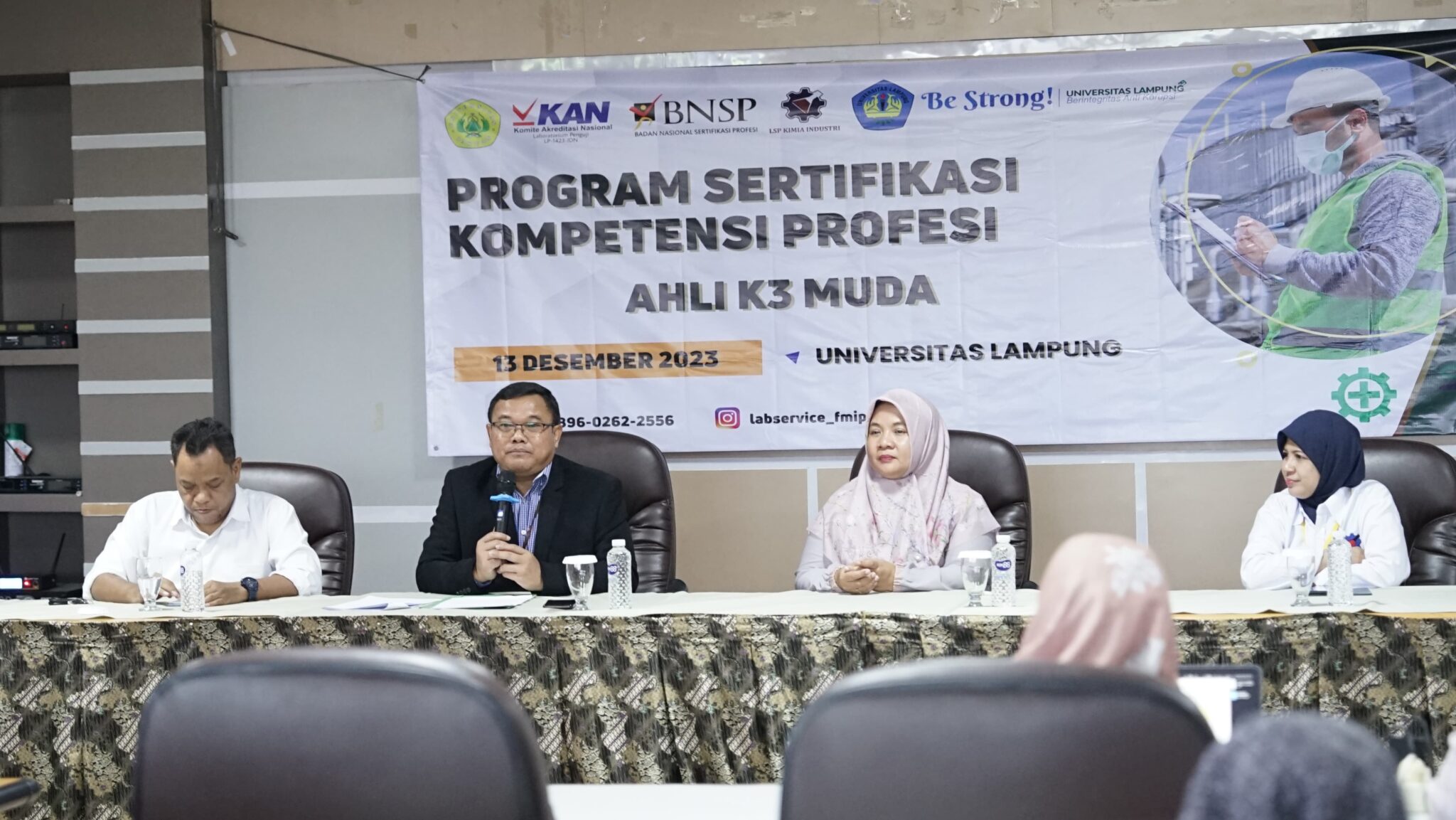 (Unila): Lembaga Pengembangan Pembelajaran dan Penjaminan Mutu (LP3M) Universitas Lampung (Unila) menggelar pelatihan sertifikasi kompetensi profesi ahli K-3 muda, pada Rabu, 13 Desember 2023, di ruang sidang satu lantai empat gedung rektorat setempat.