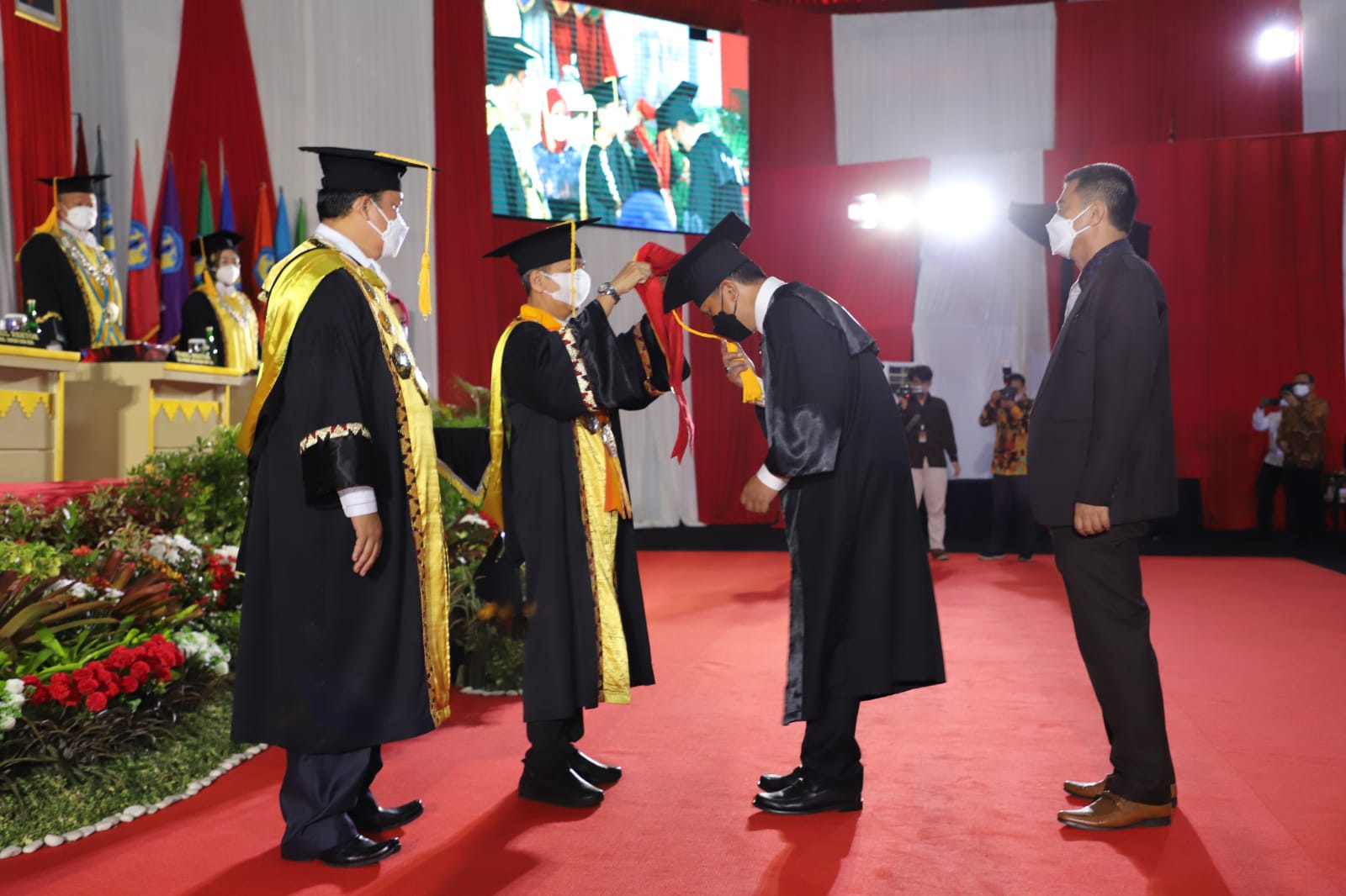 (Unila): Universitas Lampung (Unila) memberi gelar profesor kepada Kapolda Banten Irjen Pol. Dr. Rudy Heriyanto Adi Nugroho, S.H., M.H. Pemberian gelar secara resmi dilakukan pada kegiatan Pengukuhan dan Orasi Ilmiah Profesor Fakultas Hukum Universitas Lampung, Sabtu, 19 Februari 2022, di GSG Unila.