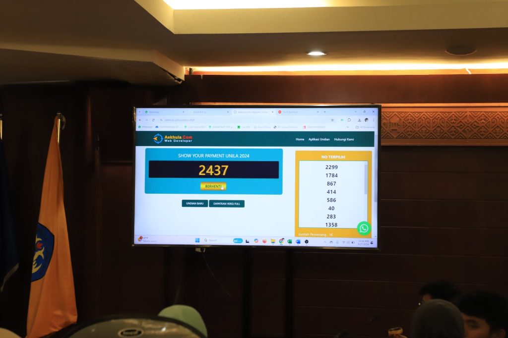 Pengundian hadiah dilakukan melalui website Aekhula.com. Kegiatan turut dihadiri Koordinator Bagian, Subkoordinator Subbagian, Staff Humas dan lima orang mahasiswa dari masing-masing fakultas yang ada di Unila.